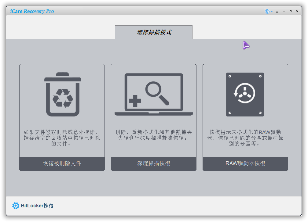 强大的数据恢复实用程序:从回收站、格式化、删除或丢失的分区恢复数据是 iCare Data Recovery 最常用的数据恢复功能之一。还有什么?它还可以帮助您在系统崩溃、没有格式化错误、无法格式化分区/卡、MBR 损坏、磁盘重新分区时恢复数据……