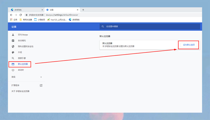 (1)打开多御安全浏览器(xduoyu.com),点击浏览器右上角三个点,点击【设置】;在打开的设置页面中,点击【默认浏览器】,然后在右边有个将多御安全浏览器 设置为默认浏览器,我们点击【设置默认选项】。