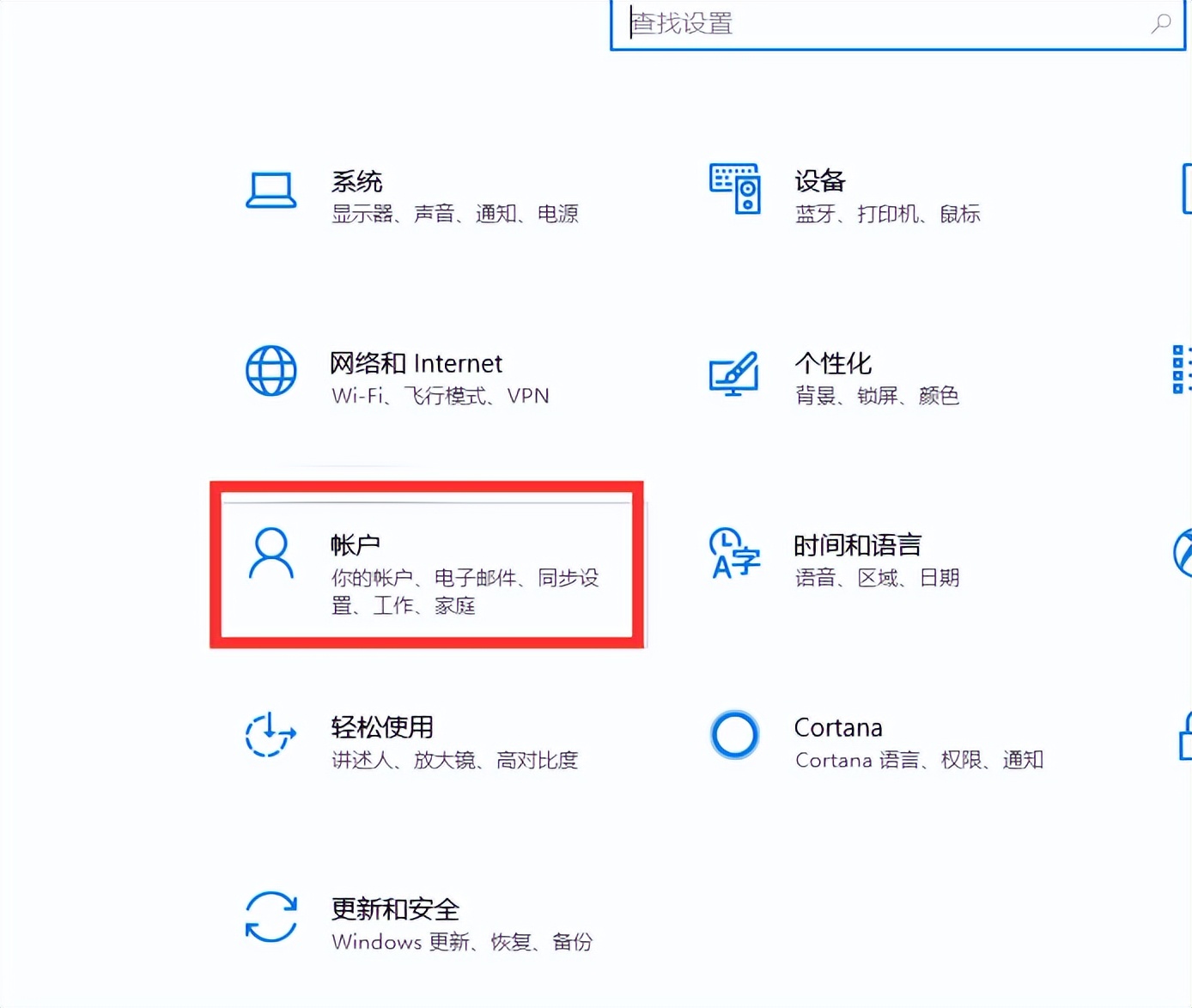 2、设置界面中找到“账户”并点击打开。