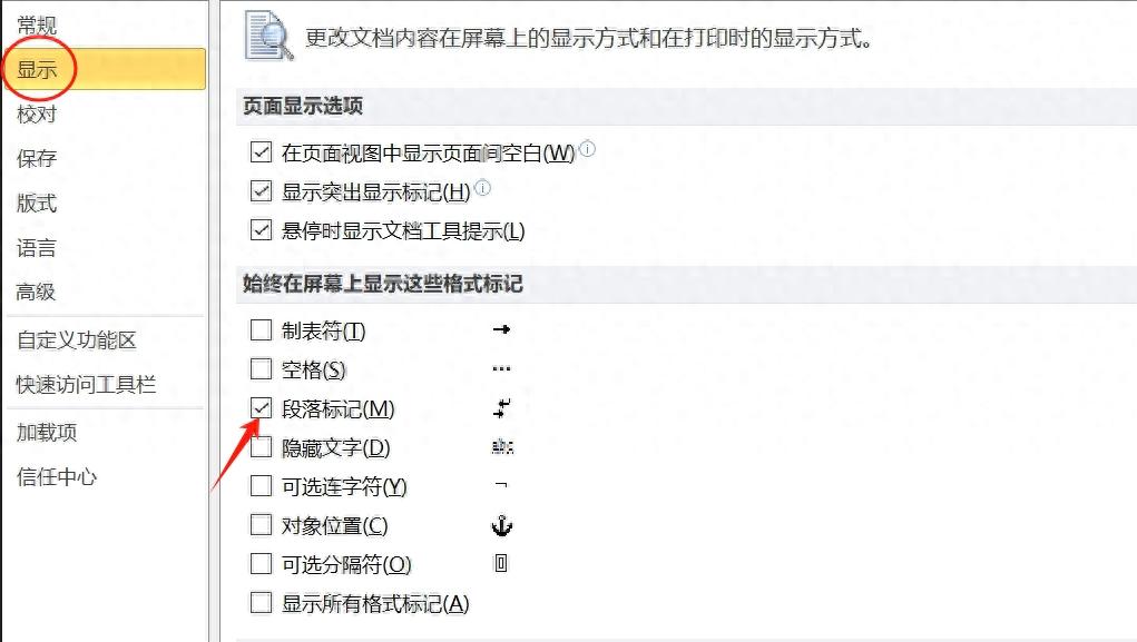 如果 Word 设置了隐藏全部段落标记,那么空白页上的段落标记无法显示,但实际是存在的,所以导致空白页无法删除,可以通【文件-选项-显示】设置显示标记,然后将标记删除,即可将空白页删除。