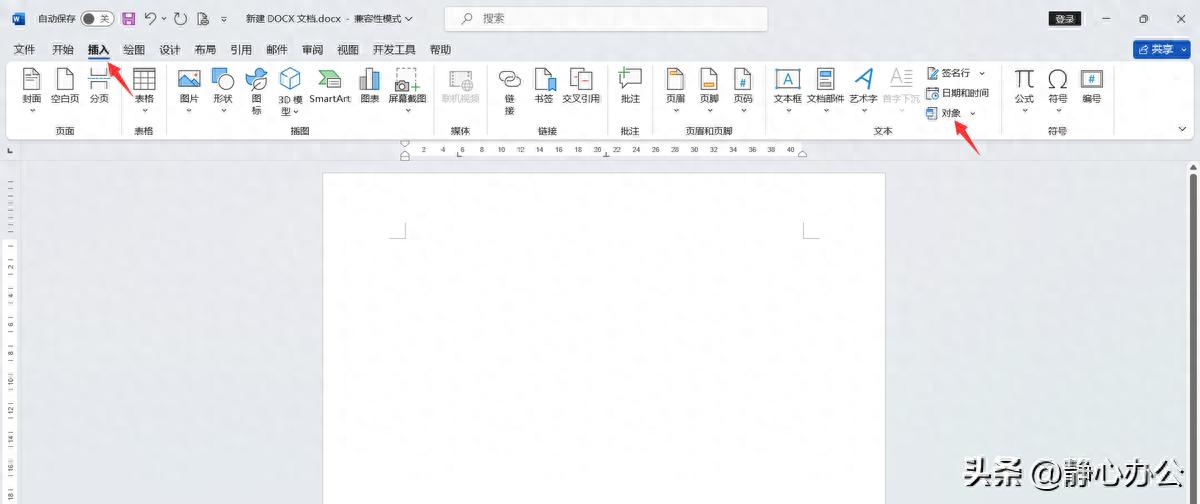 第1步:打开word文档,在【插入】选项卡下的【文本】功能组中单击【对象】按钮。
