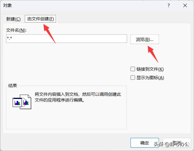 第2步:在打开的【对象】对话框中,切换到【由文件创建】标签,点击【浏览】按钮。