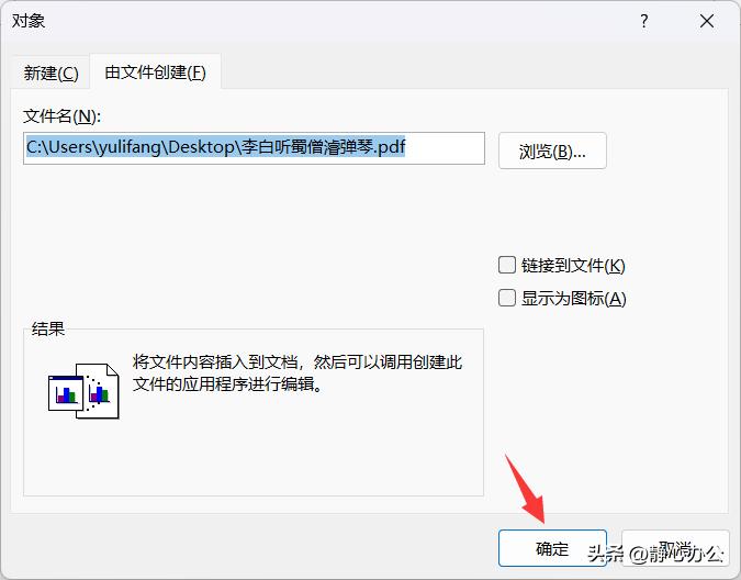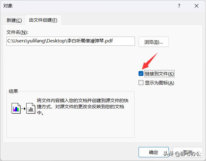 最后提示一下:如果希望插入的对象可以随原始pdf文件同步更新,则在第4步的【对象】对话框中需要勾选【链接到文件】。