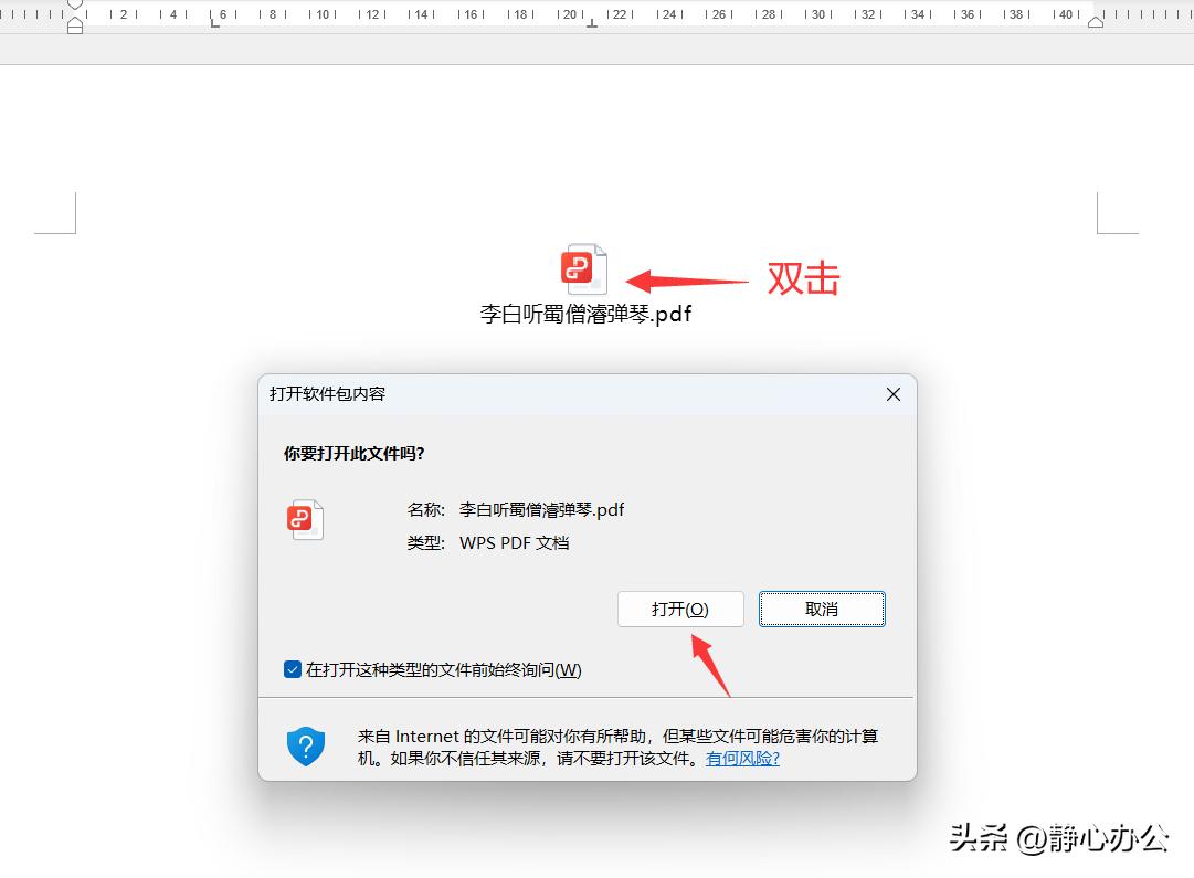 在word文档中双击插入的pdf对象,在弹出的【打开软件包内容】对话框中,单击【打开】,可以打开pdf文件。