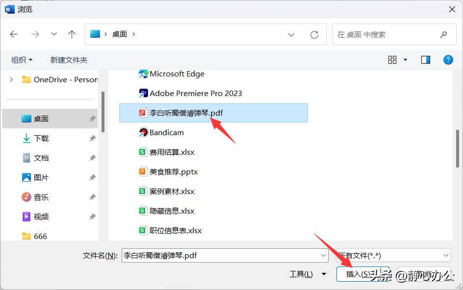 第3步:在打开的【浏览】对话框中,找到要插入word文档中的pdf文件,单击选中,单击【插入】。