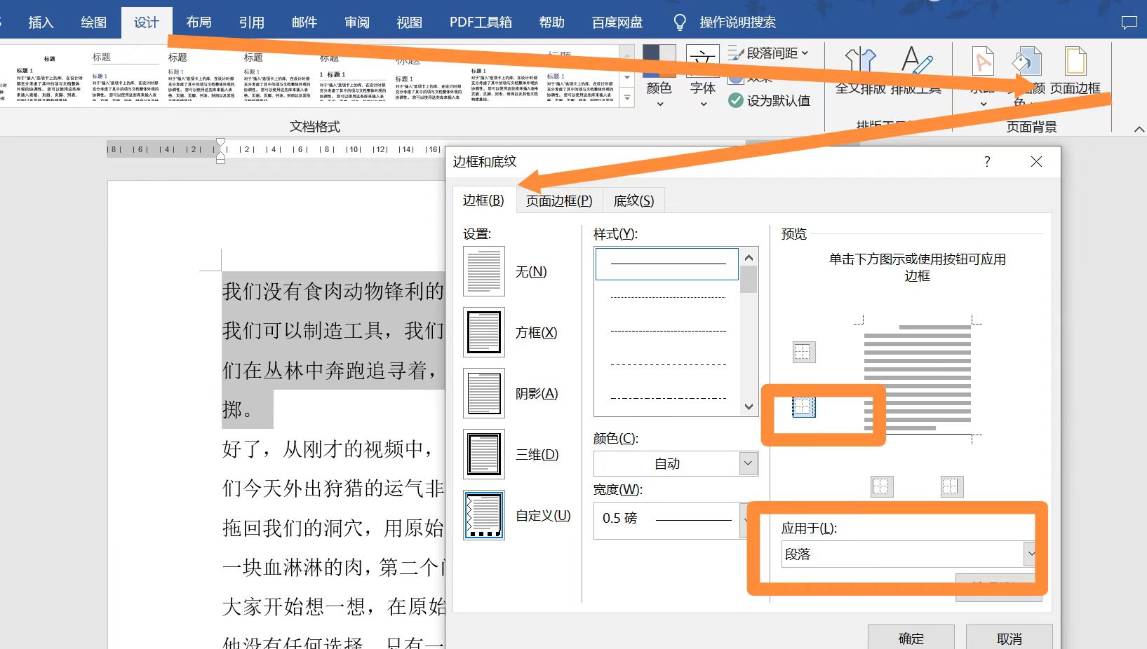 设计-页面边框-边框,选下框线,应用于段落,即可