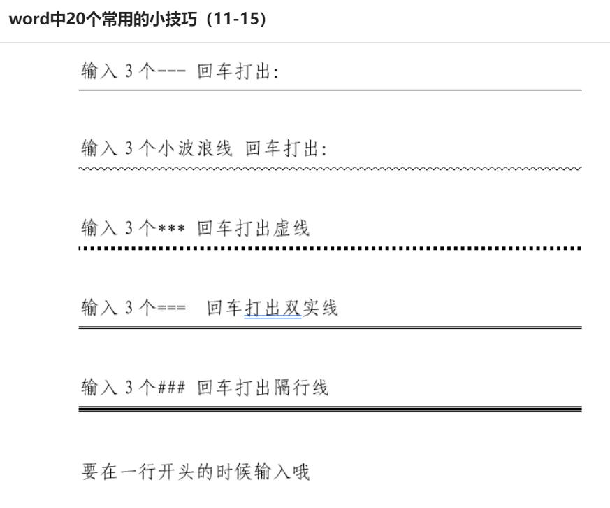 第二种方法看到过我文章的小伙伴们都知道,之前我讲过一个快速画出直线、双实线、波浪线等等特殊线条的快速的方式,还记得吗?word中20个常用的小技巧(11-15)大家可以直接翻阅我的专辑里的-《word中20个常用的小技巧(11-15)》,第14个就是啦!