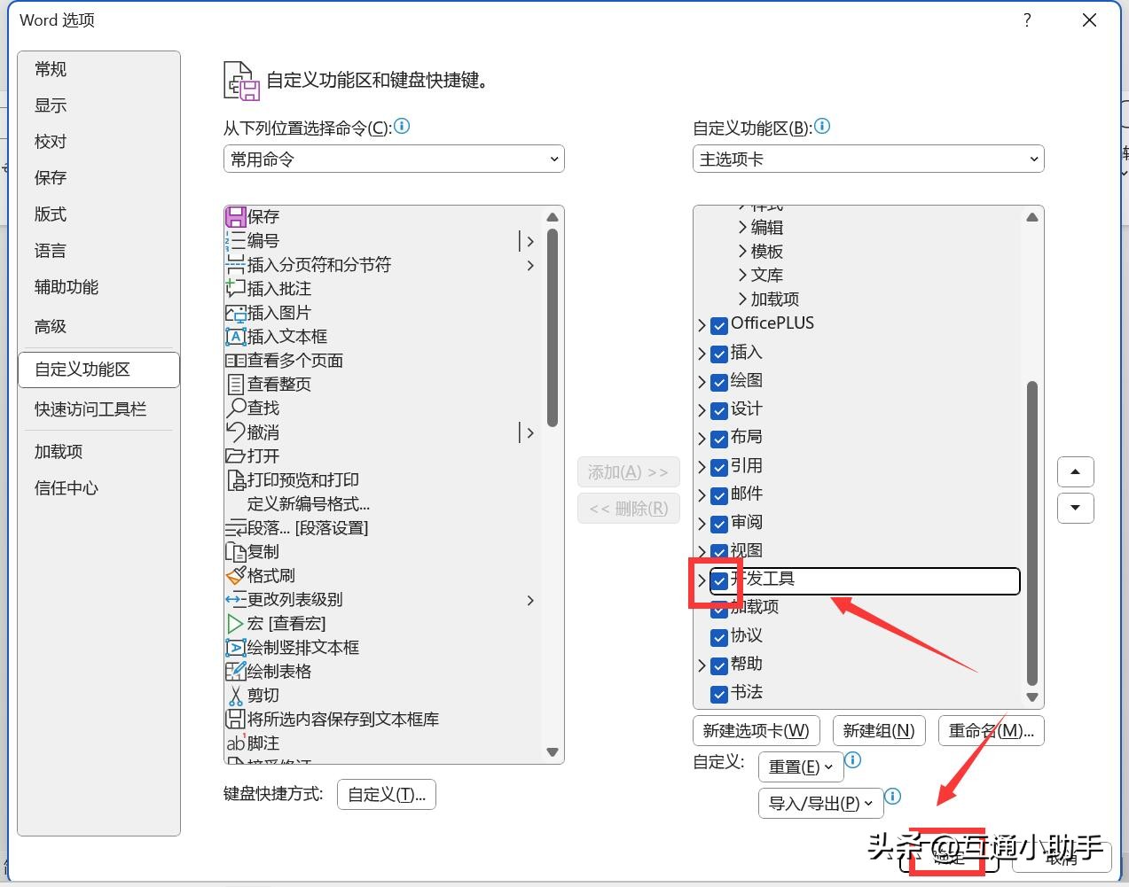 5、进入自定义功能区,勾选“开发工具”,点击“确定”。