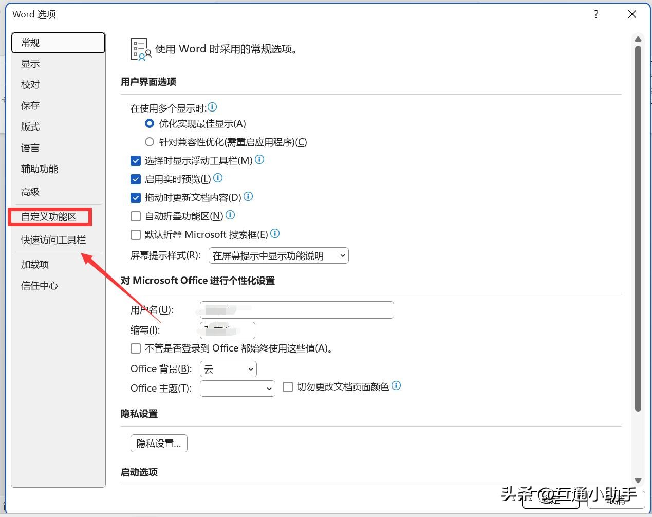 4、进入word选项,点击“自定义功能区”。