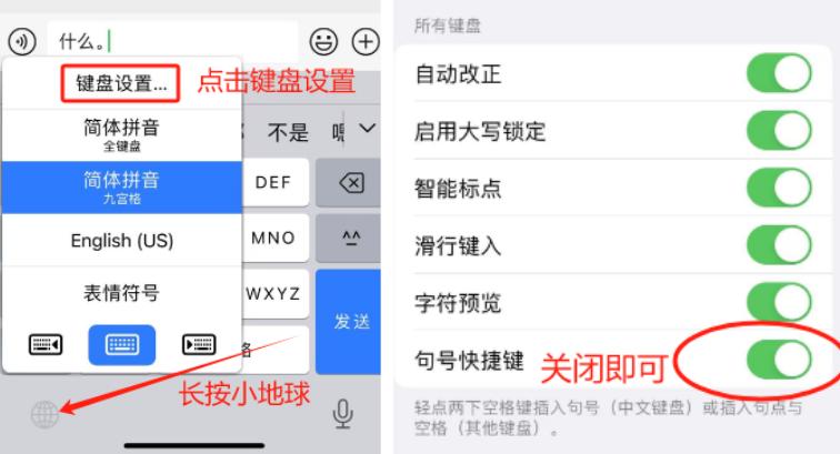 我们可以长按键盘左下角的“小地球”,然后点击键盘设置,接着把“句号快捷键”关掉就好了。