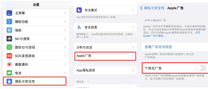 关闭个性化广告:打开“设置”,进入“隐私与安全性”;点击“Apple广告”,然后关闭“个性化广告”。