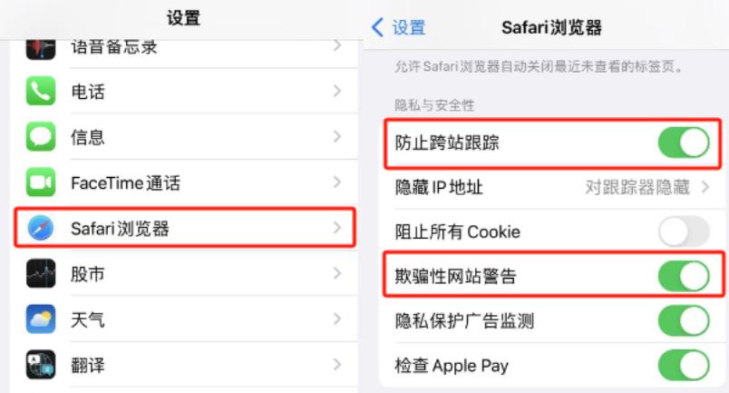防止网站跟踪:打开“设置”,进入“Safari浏览器”;打开“防止跨站跟踪”和“欺骗性网站警告”等开关。