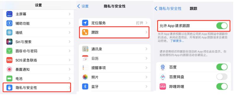 关闭APP跟踪:打开“设置”,进入“隐私与安全性”;点击“跟踪”,然后关闭“允许APP请求跟踪”的按钮。
