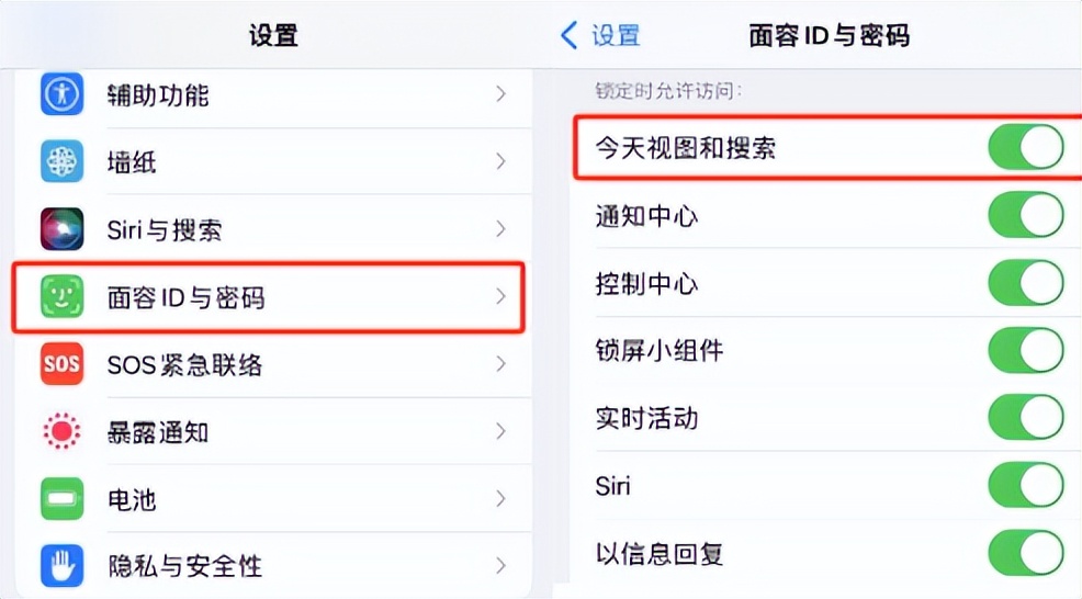 我们可以打开设置,找到面容ID与密码,然后关闭今日视图和搜素,以后锁屏状态下手机就不会乱触发了。