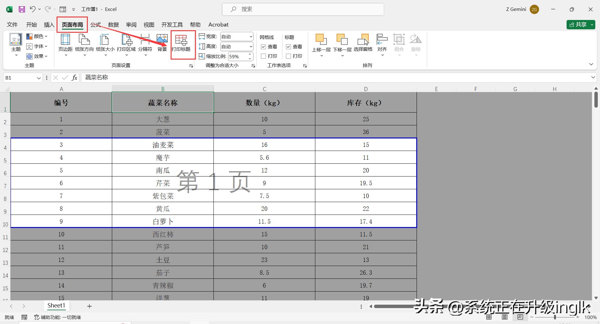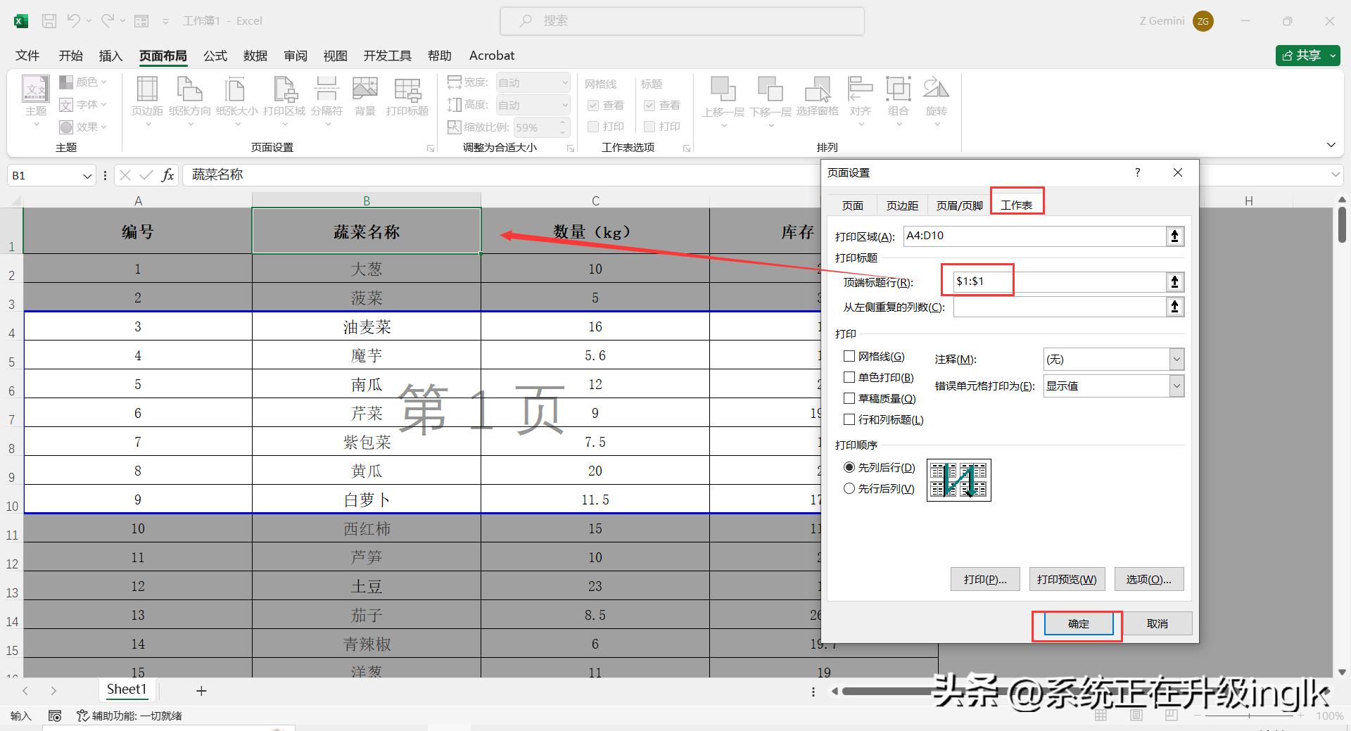 4、点击【页面布局】-【打印标题】,在打开的“页面设置”对话框中,在将“顶端标题行”拾取:$1:$1(即:表格标题所在行),然后点击【确定】即可。这样打印区域即可自带标题行。