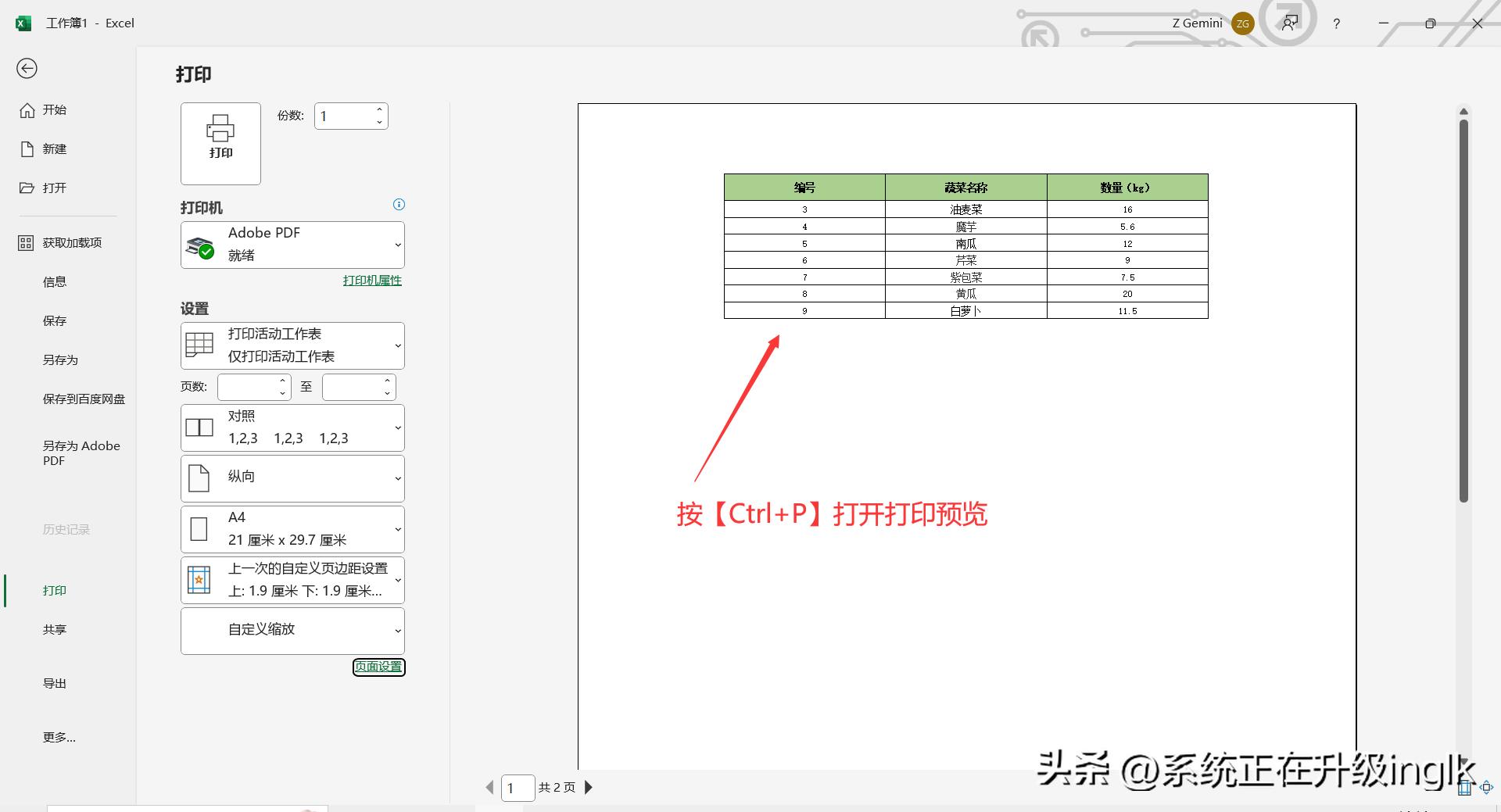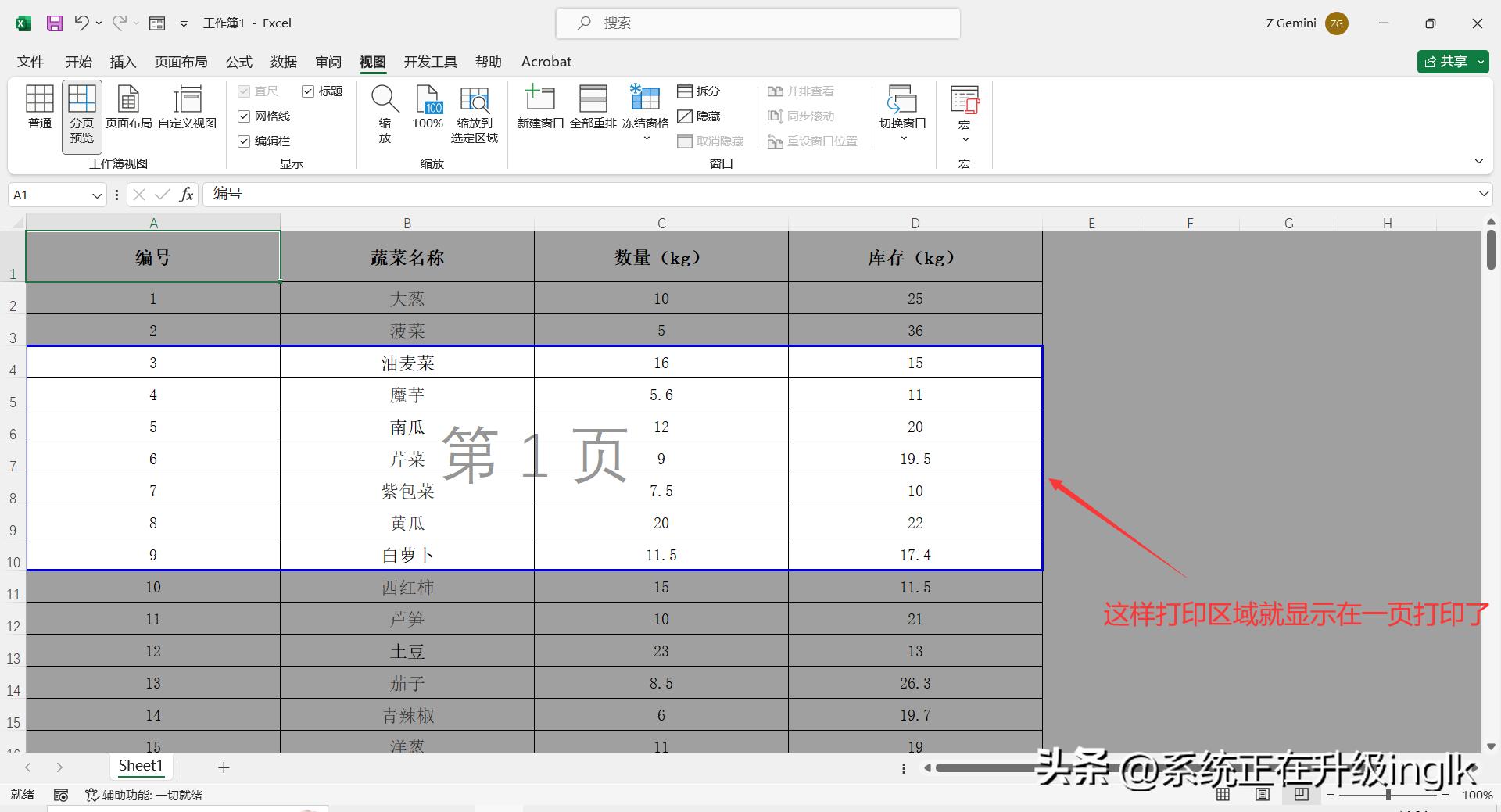 5、全部设置完成,按快捷键【Ctrl+P】打开“打印预览”界面,显示的即是指定打印区域的数据,且打印在一个页面中自带标题。