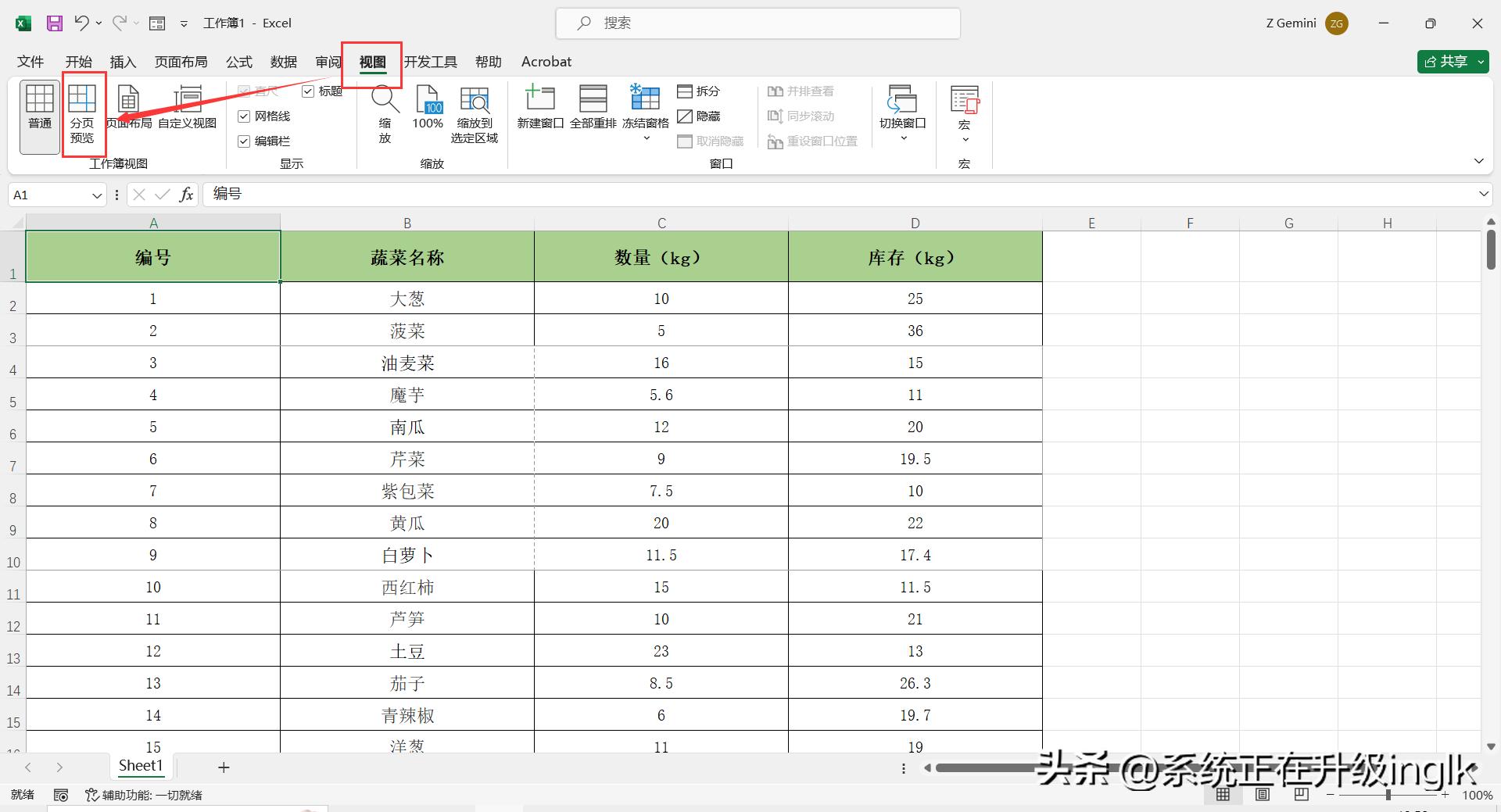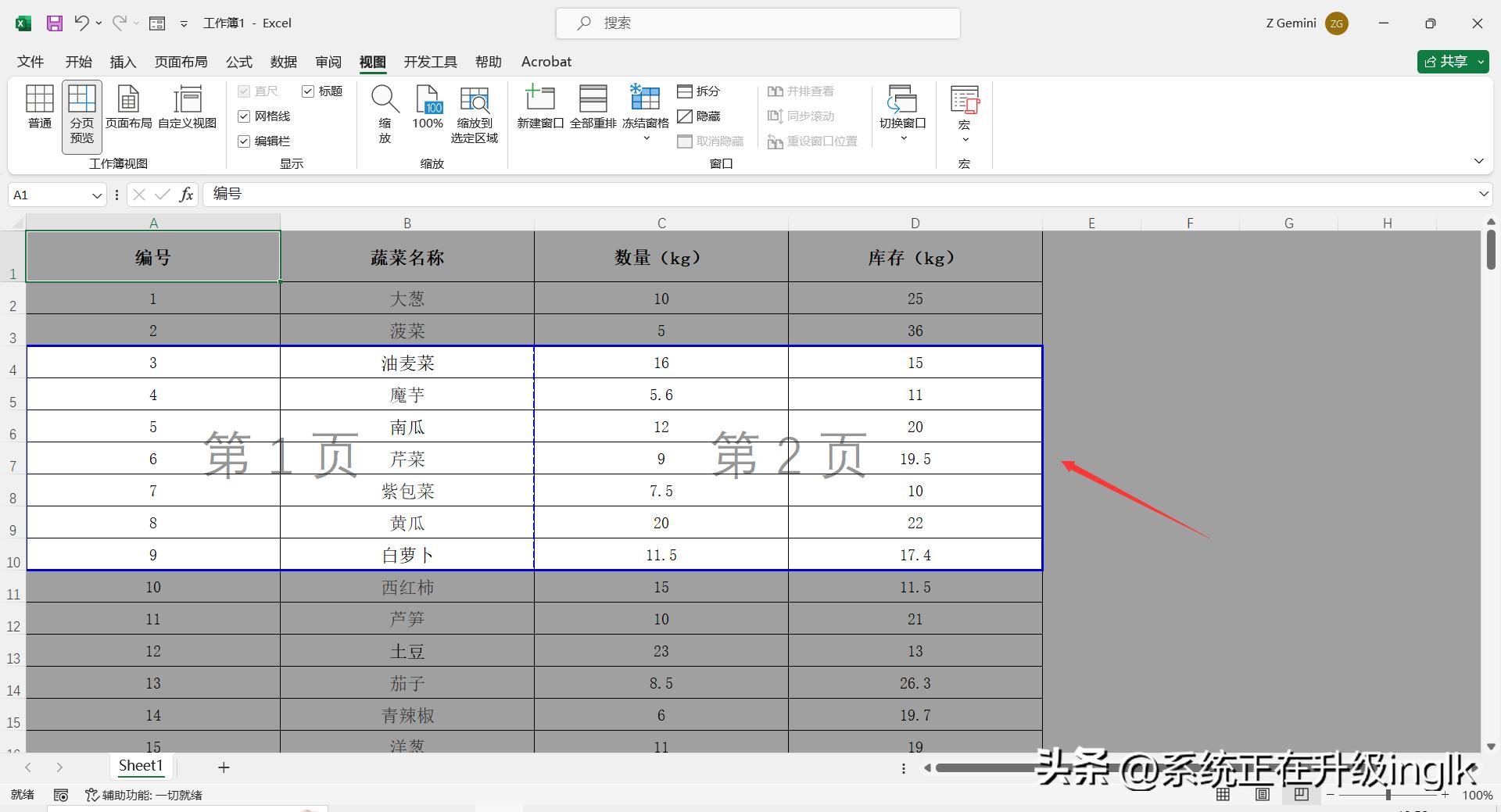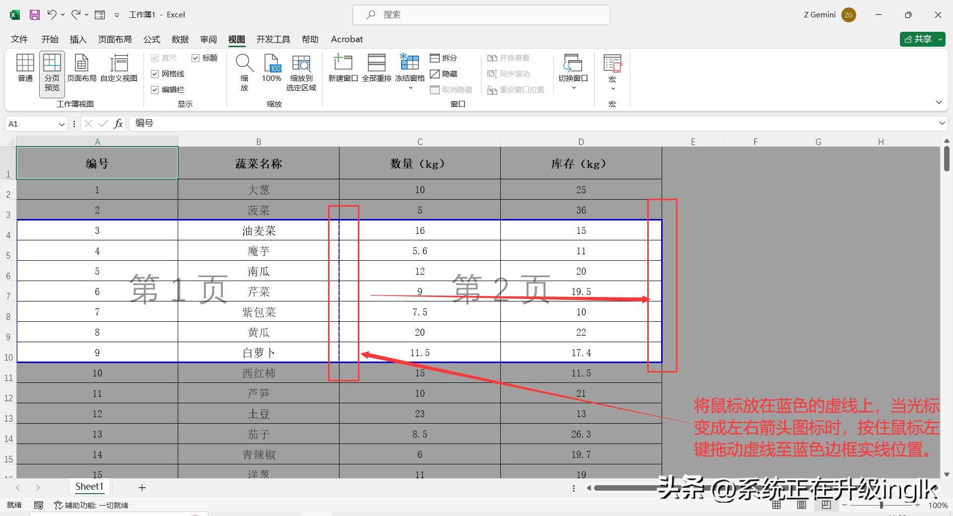 2、继续点击【视图】-【分页预览】,页面打印区域出现蓝色边框实线,以及打印界限的蓝色虚线。