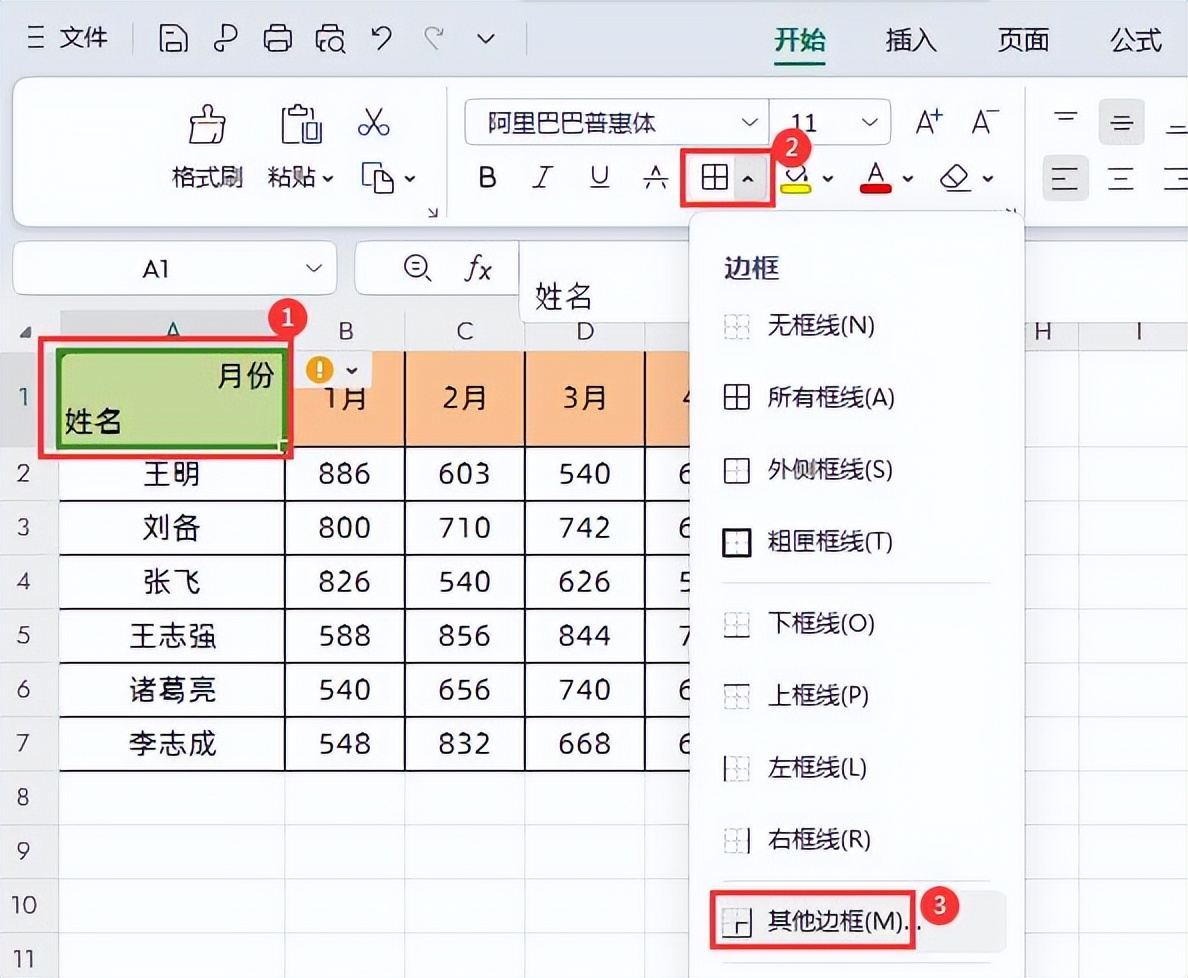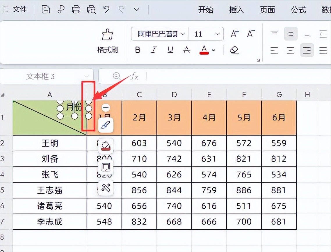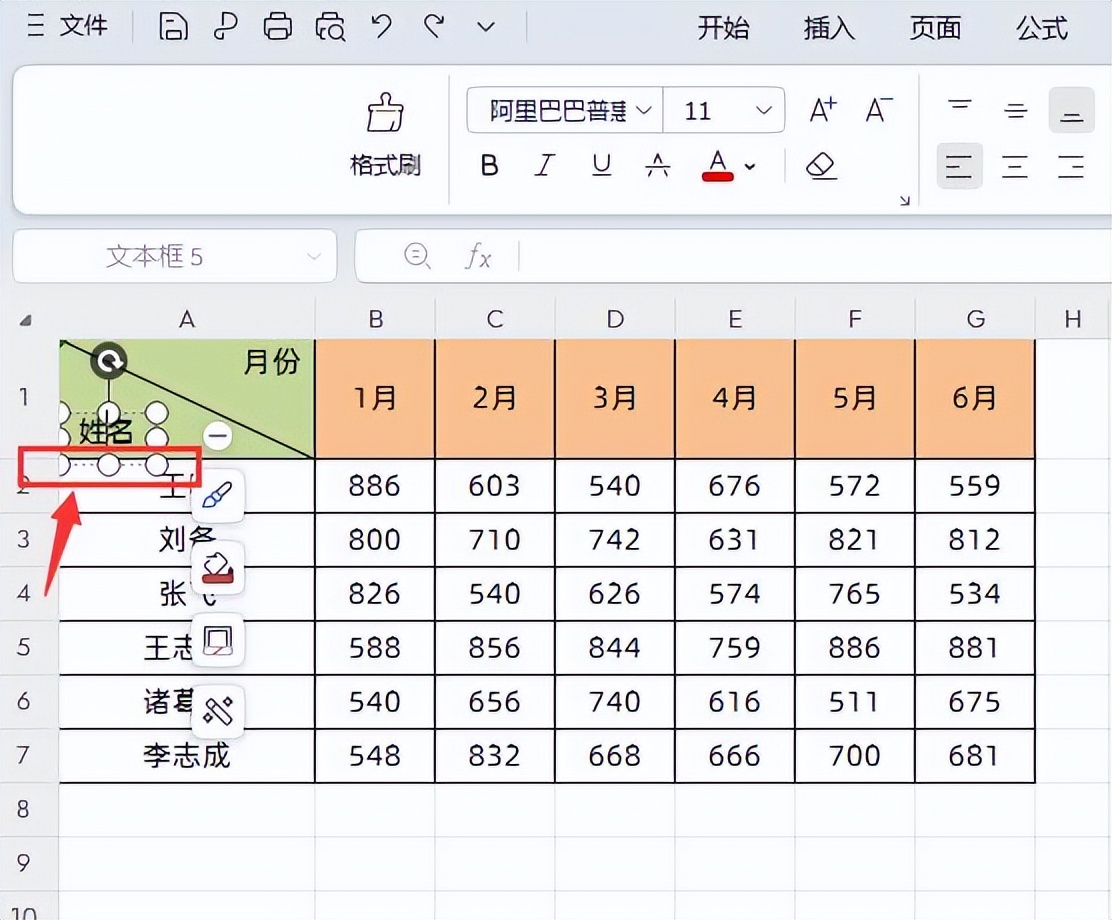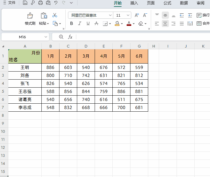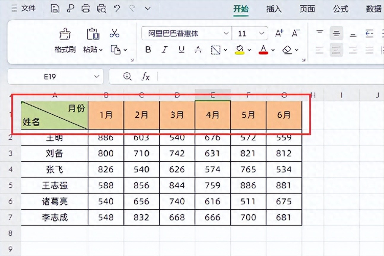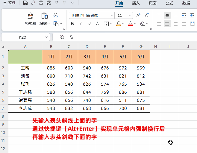 ①首先在表头单元格中输入“月份”→接着通过快捷键【Alt+Enter】实现单元格内强制换行→然后再输入“姓名”,如下图所示