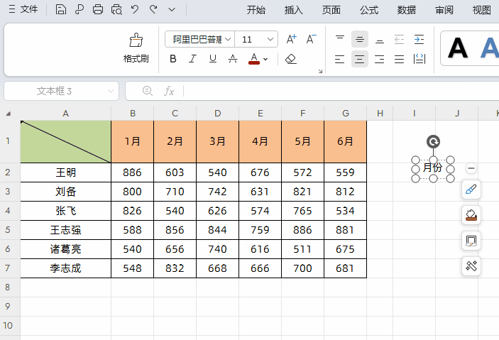 ③把“月份”文本框移动到斜线表头位置右上角,并且文本框的右边缘一定要超过单元格黑色的竖线→然后设置文本框内文字对齐方式为【垂直居中】和【右对齐】,如下图所示