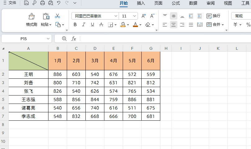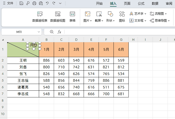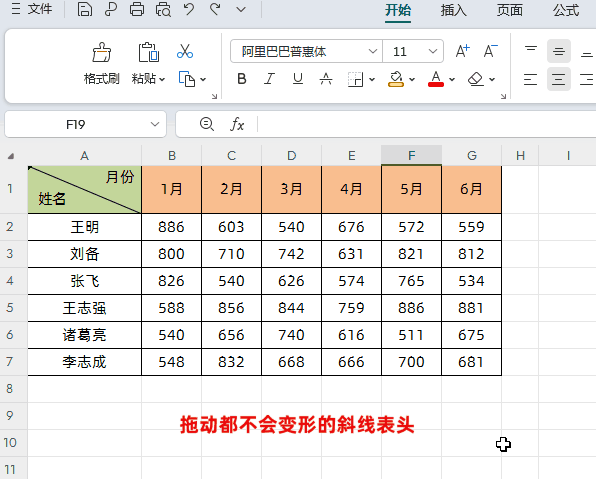 如下图所示,我们需要制作一个月份、姓名的斜线表头