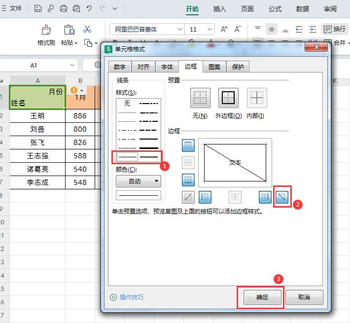 ③先选中表头单元格→点击【边框】在下拉菜单中的选中【其它边框】→在弹出的“单元格格式”窗口中,【线条】选择下面的实线,【边框】选择右下角的【斜边框】样式→最后点击确定即可