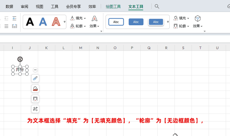 ②选中改成绘制的【文本框】,为文本框选择“填充”为【无填充颜色】,“轮廓”为【无边框颜色】,就是把文本框设置成透明的。