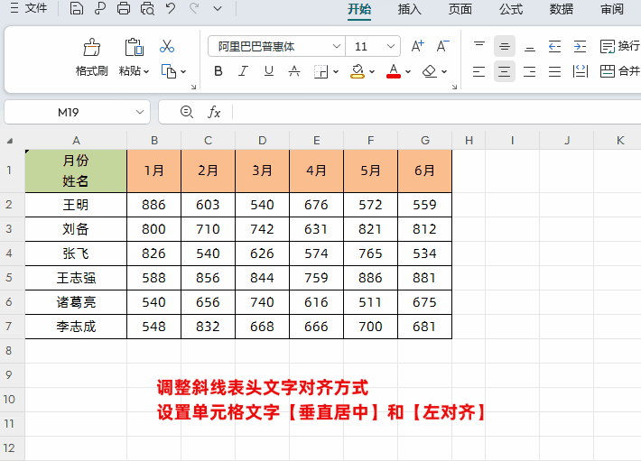 ②调整斜线表头文字对齐方式:先选中表头单元格→然后设置单元格文字【垂直居中】和【左对齐】→然后再把上面的“月份”通过空格键移动到靠右侧合适的位置,如下图所示
