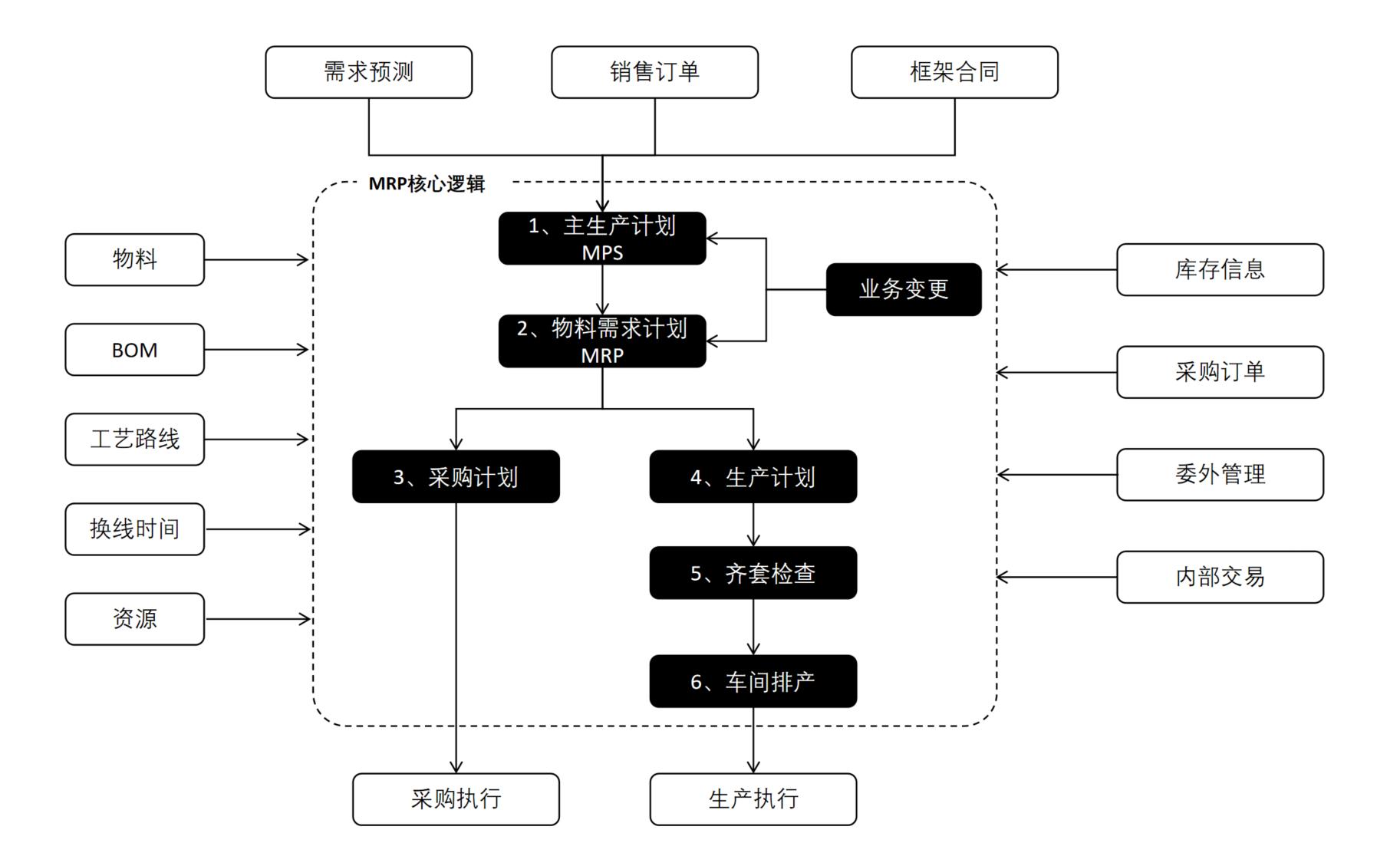 MRP是ERP中最重要的功能模块,通过MRP我们能够让企业内的各类资源高效流动,实现制造企业的供需平衡。MRP的整体业务流程如下图: