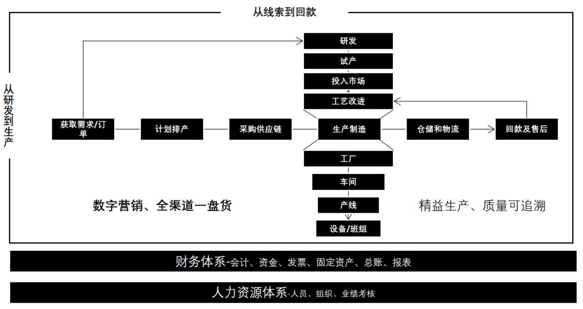 通过以上的例子我们对ERP应该有些感觉了,ERP就是把企业内部从线索到回款、从研发到生产的整个过程进行记录的系统,它是能够对企业内部的各种资源(人、机、物、财)进行计划、使用的管理系统,并最终能够输出满足财务会计要求的账目数据以及总账报表。以下是ERP系统能够覆盖的业务范围。