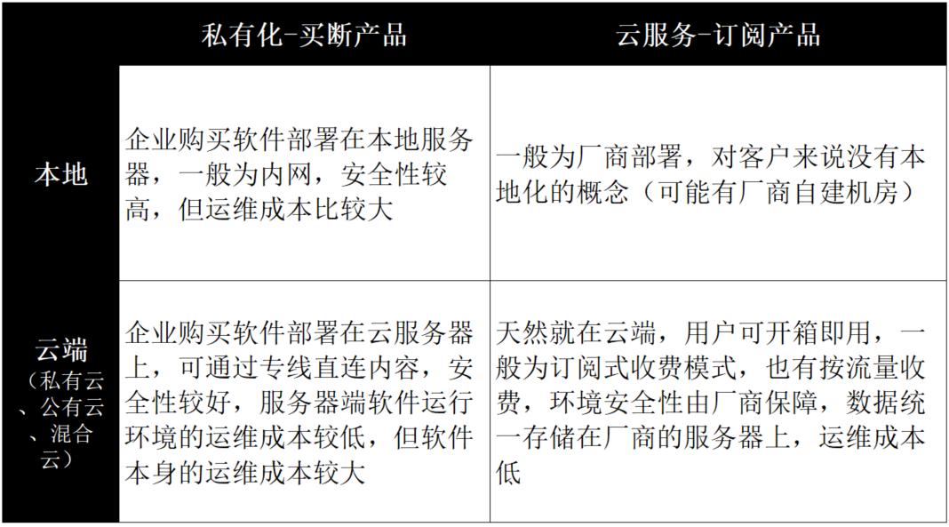 软件部署是指将软件项目本身,包括配置文件、用户手册、帮助文档等进行收集、打包、安装、配置、发布的过程。部署方式主要可以分为私有化部署和云服务,私有化部署又可分为本地化部署和云端部署,具体内容如见下图: