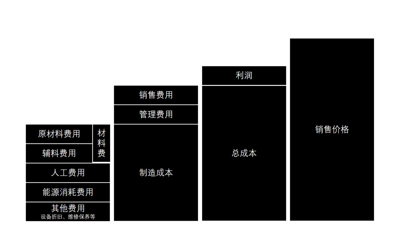 说完MRP运算后,我们在看下ERP中的生产成本管理,这也是大多数制造企业上ERP需要去解决的问题之一。生产成本也就是一般生产企业生产一定种类、一定数量的产品时所发生的原材料费用、人工费用、辅助材料费用、能源消耗费用、设备折旧费用、管理费、研发费用等其他相关费用的总和,正是反映企业生产组织的合理程度、劳动生产率的高低、设备利用程度、经营管理水平的一项综合指标。下图为制造企业生产成本和销售价格示意图:
