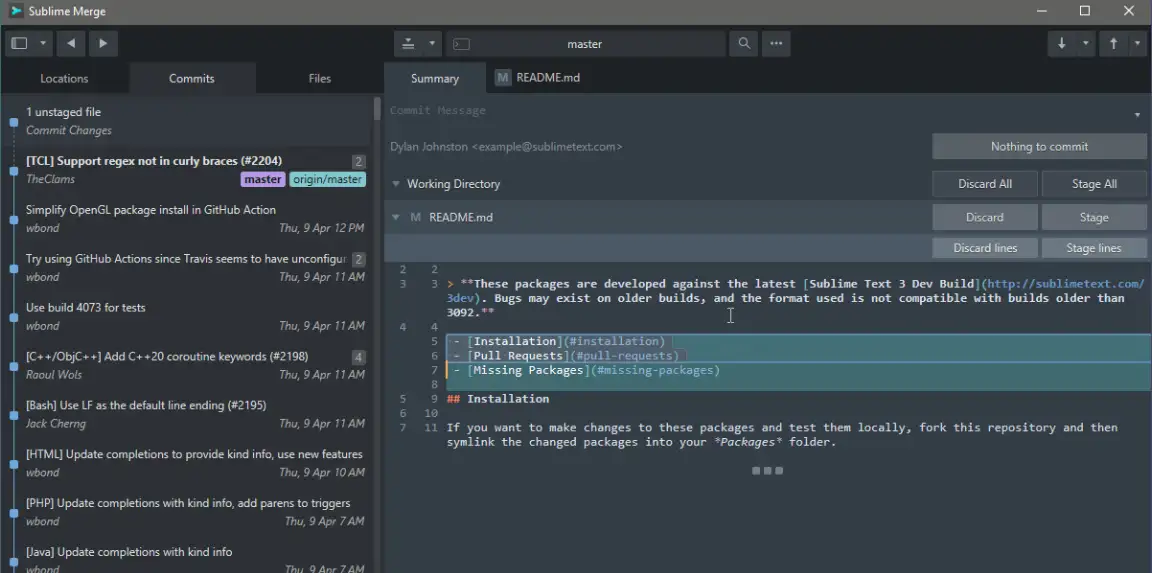 • 极速提交:快速 Stage Files、Hunks 和 Lines,无需等待,Sublime Merge 以极快的速度处理 Git 操作。
