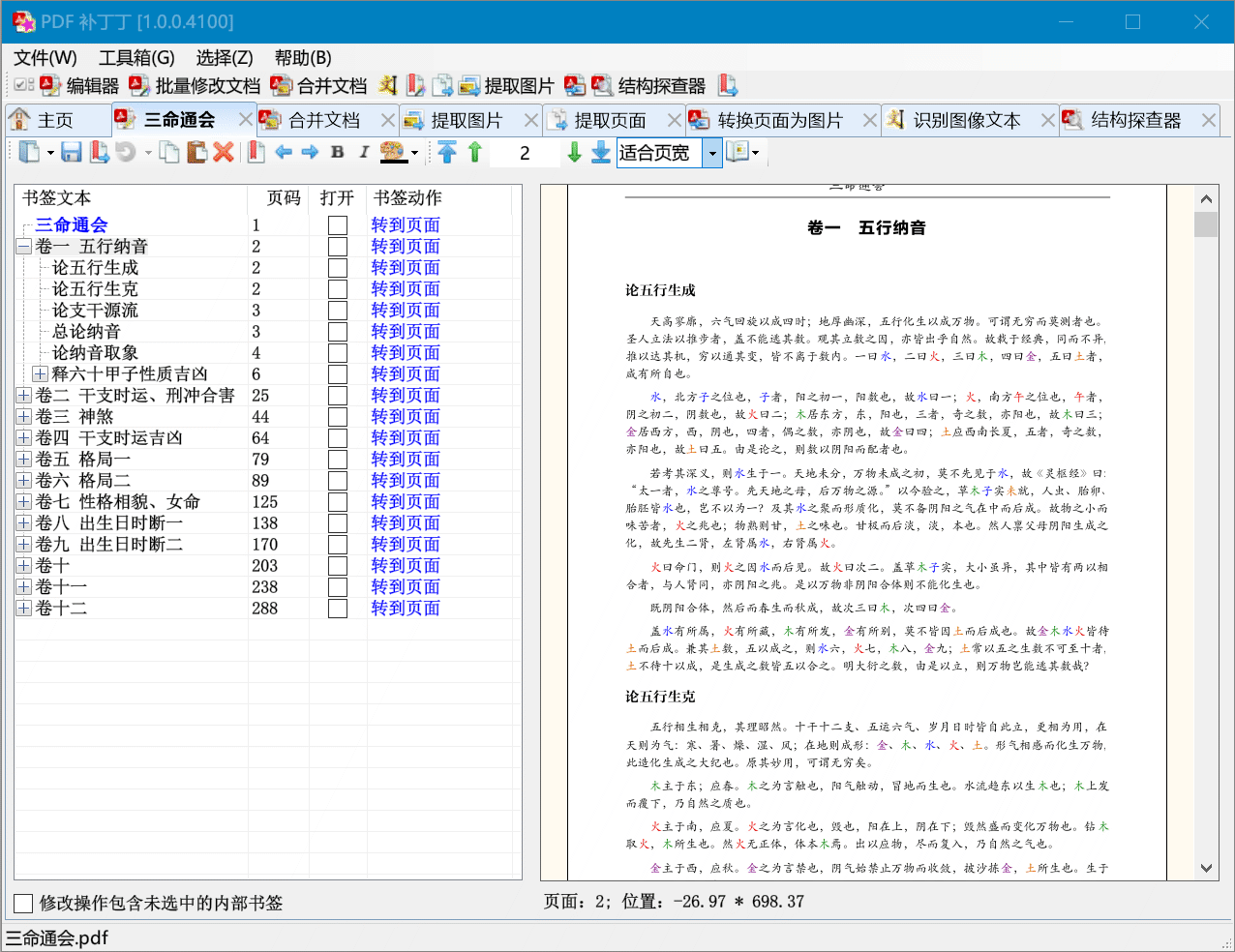 贴心PDF书签编辑器:带有阅读界面(具有便于阅读竖排文档的从右到左阅读方式),可批量修改PDF书签属性(颜色、样式、目标页码、缩放比例等),在书签中执行查找替换(支持正则表达式及XPath匹配、可快速选择篇、章、节书签),自动快速生成文档书签。
