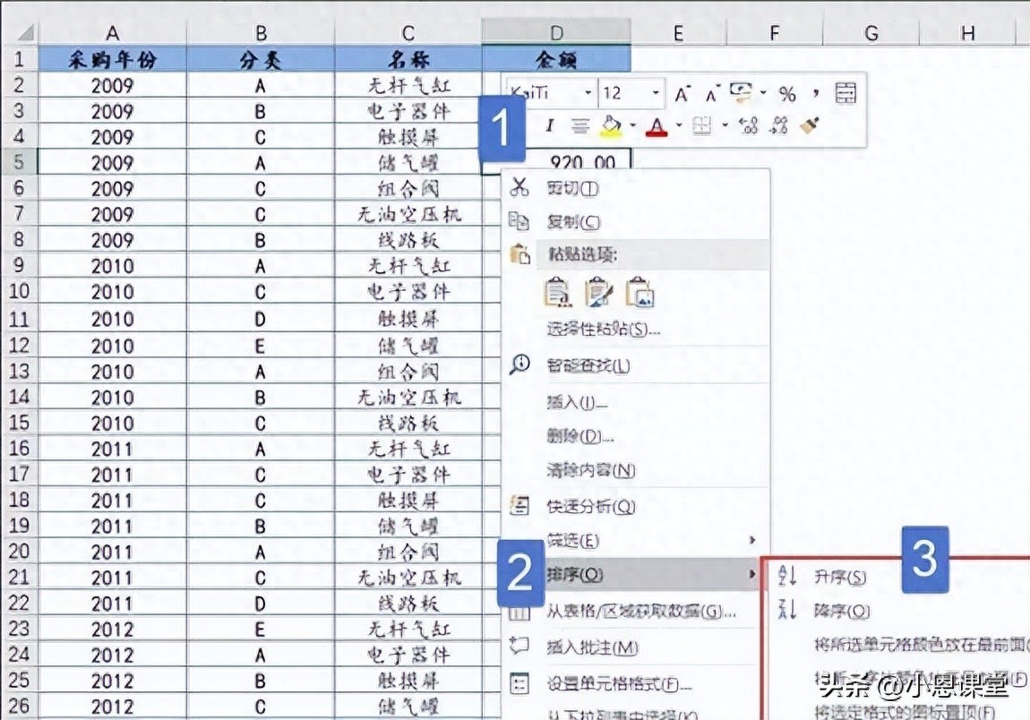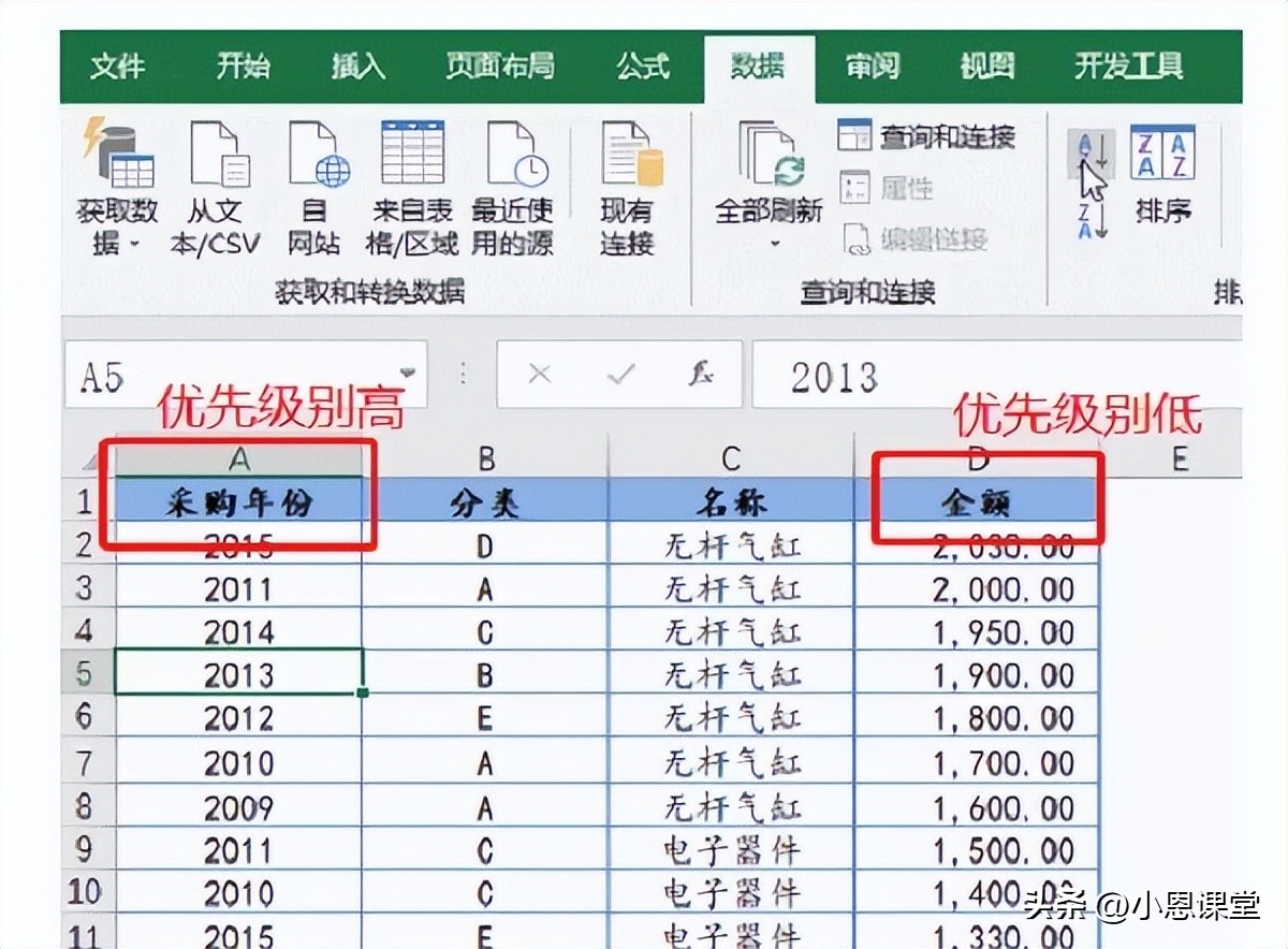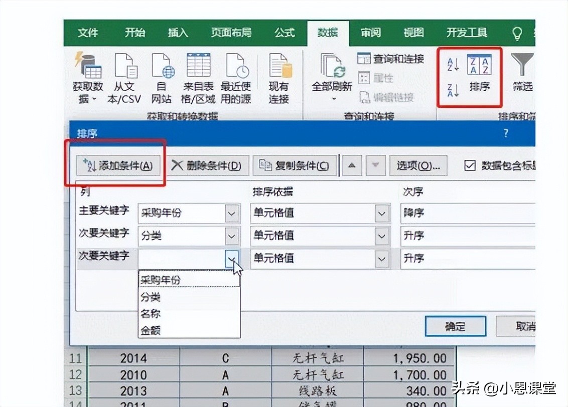 比如下图中的操作,结果就是先按年份排序。同一个年份的,再按分类排序。同一个年份并且同一个分类的,再按金额排序。这样操作下来不会感觉思绪打乱,轻轻松松实现自己要排的顺序。