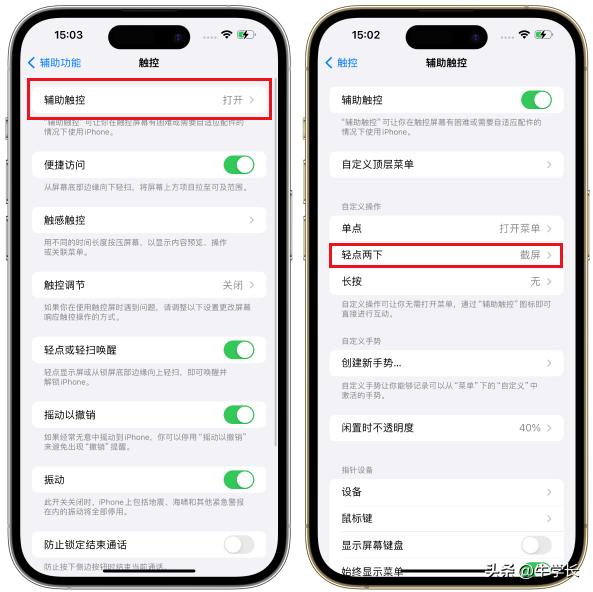 选择「辅助触控」选项,找到「自定义操作」,可以选择设置「轻点两下」或者「长按」为「截屏」的指令,这样就可以利用点两下或长按小白点的方式进行屏幕截图。