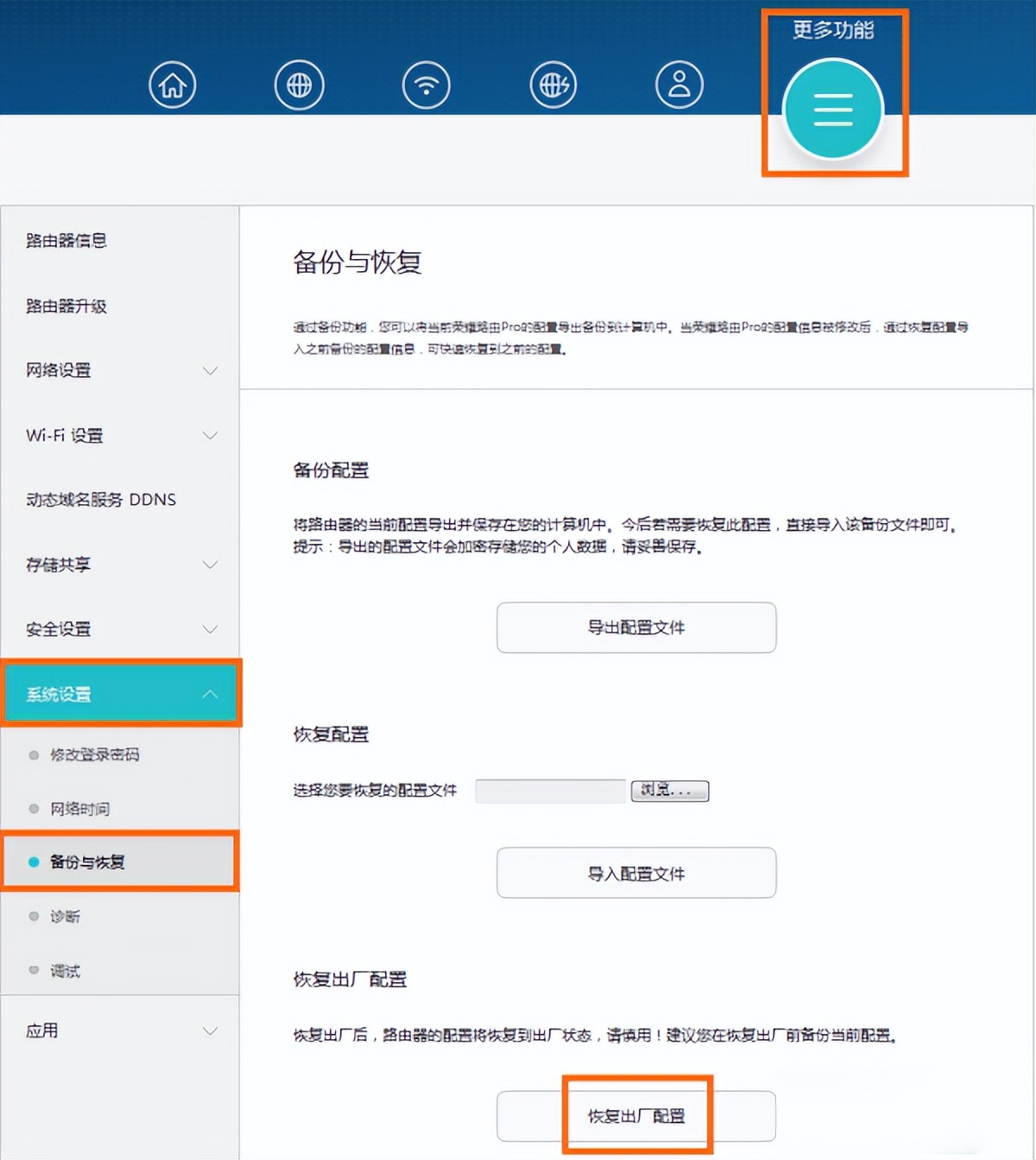 除了长按Hi按键来恢复出厂设置,还可以登录到荣耀路由器的设置界面,找到“恢复出厂设置”的选项,然后点击页面中的按钮,也可以恢复出厂设置。