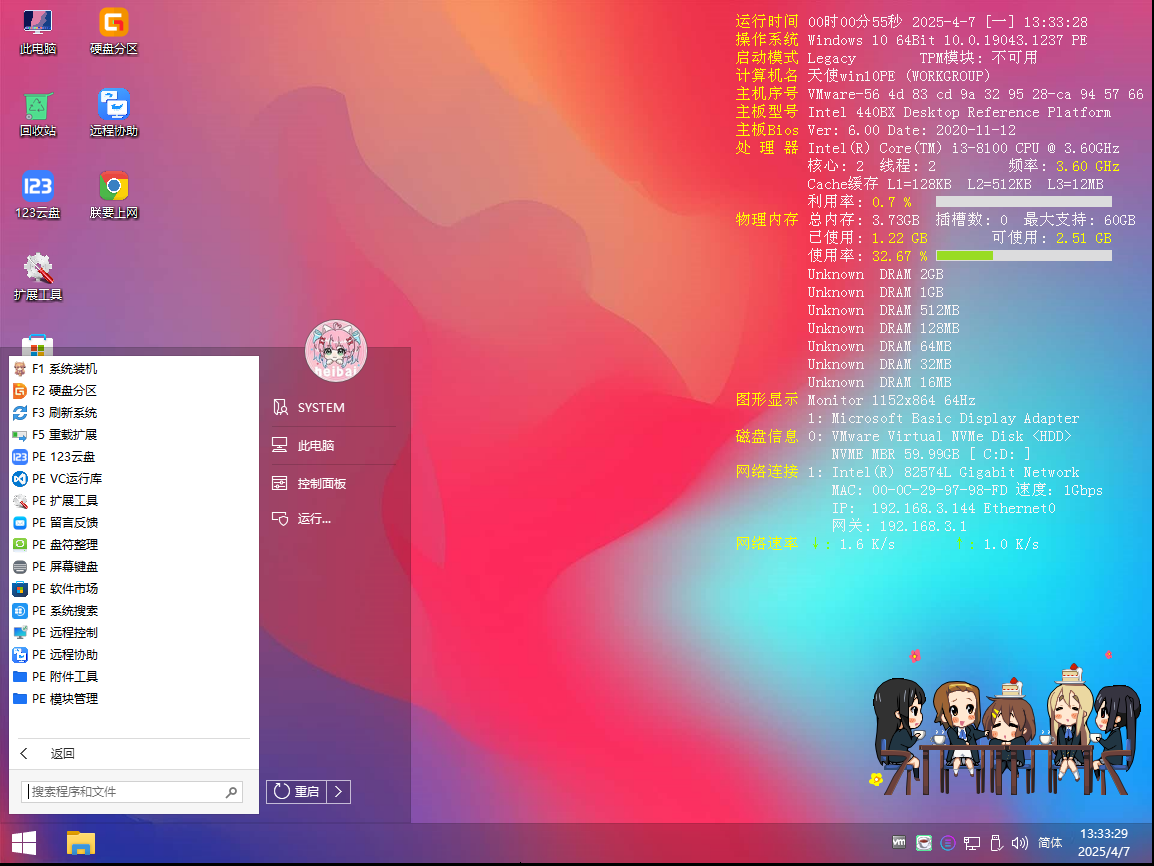 ⭐:集成系统安装、硬盘检测、数据恢复、引导修复、驱动管理、密码清除、上网浏览、影音播放。