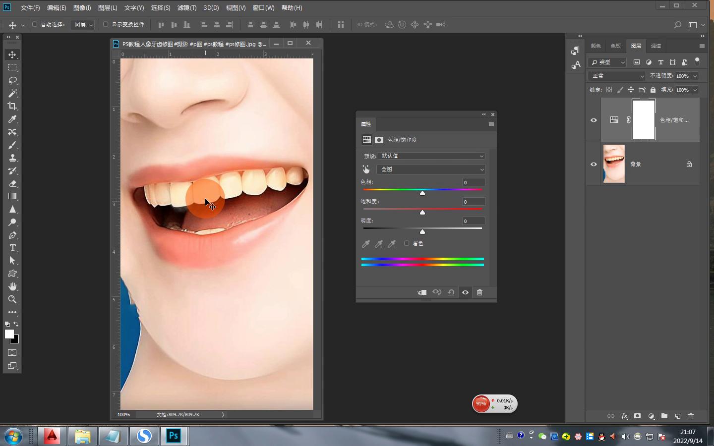 今天主要学习一下ps人像牙齿美白。比如美女牙齿发黄,我想美白过后处理后是这样的,就是牙齿很白,其他地方保持原有的色调。当然方法很多,明天讲的其他方法比如通过创建选区调色也可以,或者是通过简单工具也可以。但是今天换一种方法,是通过添加新代填充调整里面思想饱和度。直接进入正题。
