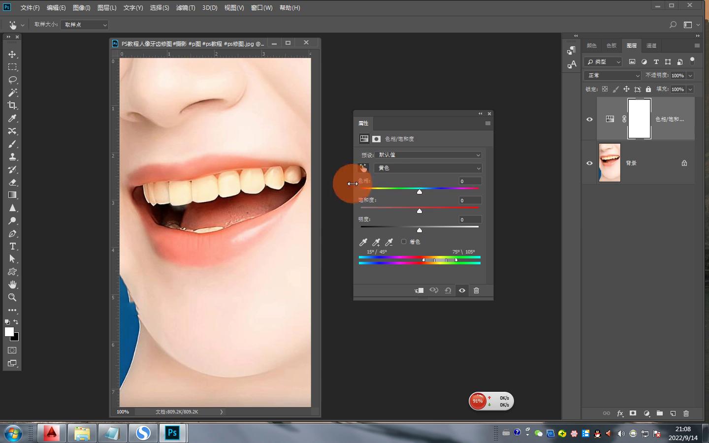 ·当然因为现在主要是变成洁白的牙齿,所以色相干什么?暂时不动。动什么?点击这个手就表示拾取颜色,点击手,当前手状就按下去了,就激活了。
