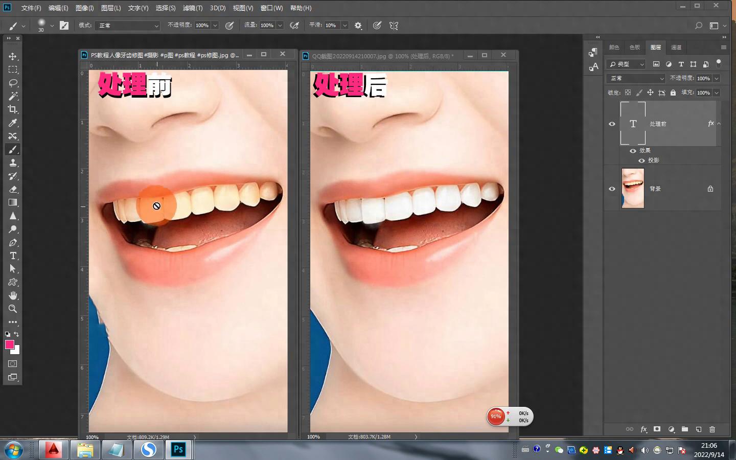 ·现在我在用画笔,所以最后一步画笔闭,然后将前景色白色调整,黑色就是保持背景的效果。用画笔在蒙版上面涂抹白色表示调整后的效果,用画笔在牙齿上面涂抹,涂抹的效果就是调整后的效果。