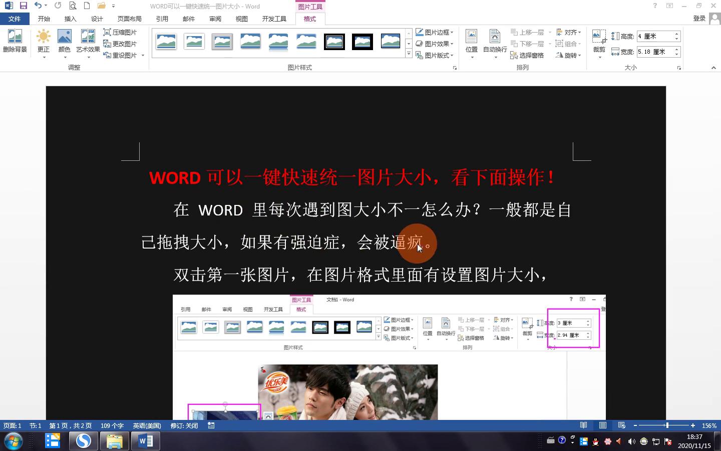 ·第一步,双击第一张图片,在图片格式里面有设置图片大小,比如双击第一张图片,双击它,在图片格式设置图片大小,比如设置四乘一个三,这是第一步。
