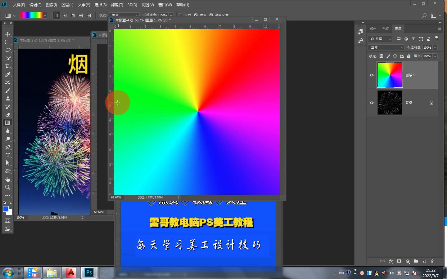 ·当然如果觉得这种彩虹印花不好看,可以用其他的,比如用这种颜色拉一个渐变都可以产生各种各样的是吧?烟花效果非常神奇,还可以再编辑,别说颜色太深了,搞洋红色、搞粉红色都行,这是红色是吧?其实这个样式由中心向四周渐变。