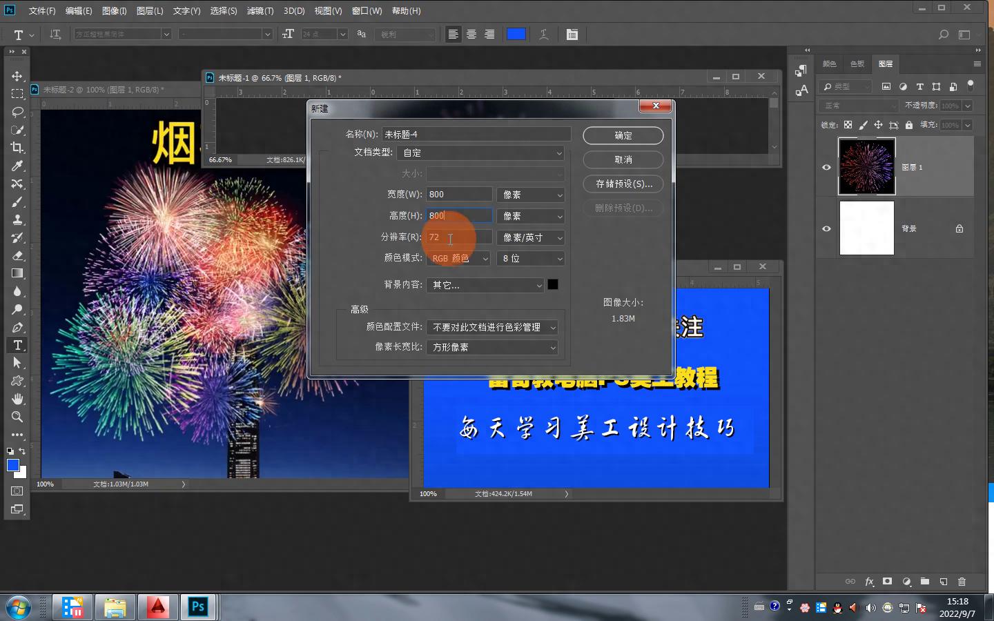 第一步,新建文件,ctrl加in键。新建多大?当然不是特殊要求,新建个八百乘八百,分辨率是七十二。背景定了可以直接用黑色,省的是用烟花在黑色的背景当中衬托出,看着才看的比较舒服。如果白色背景看的不清楚,所以用黑色背景就不需要再填充黑色背景了。
