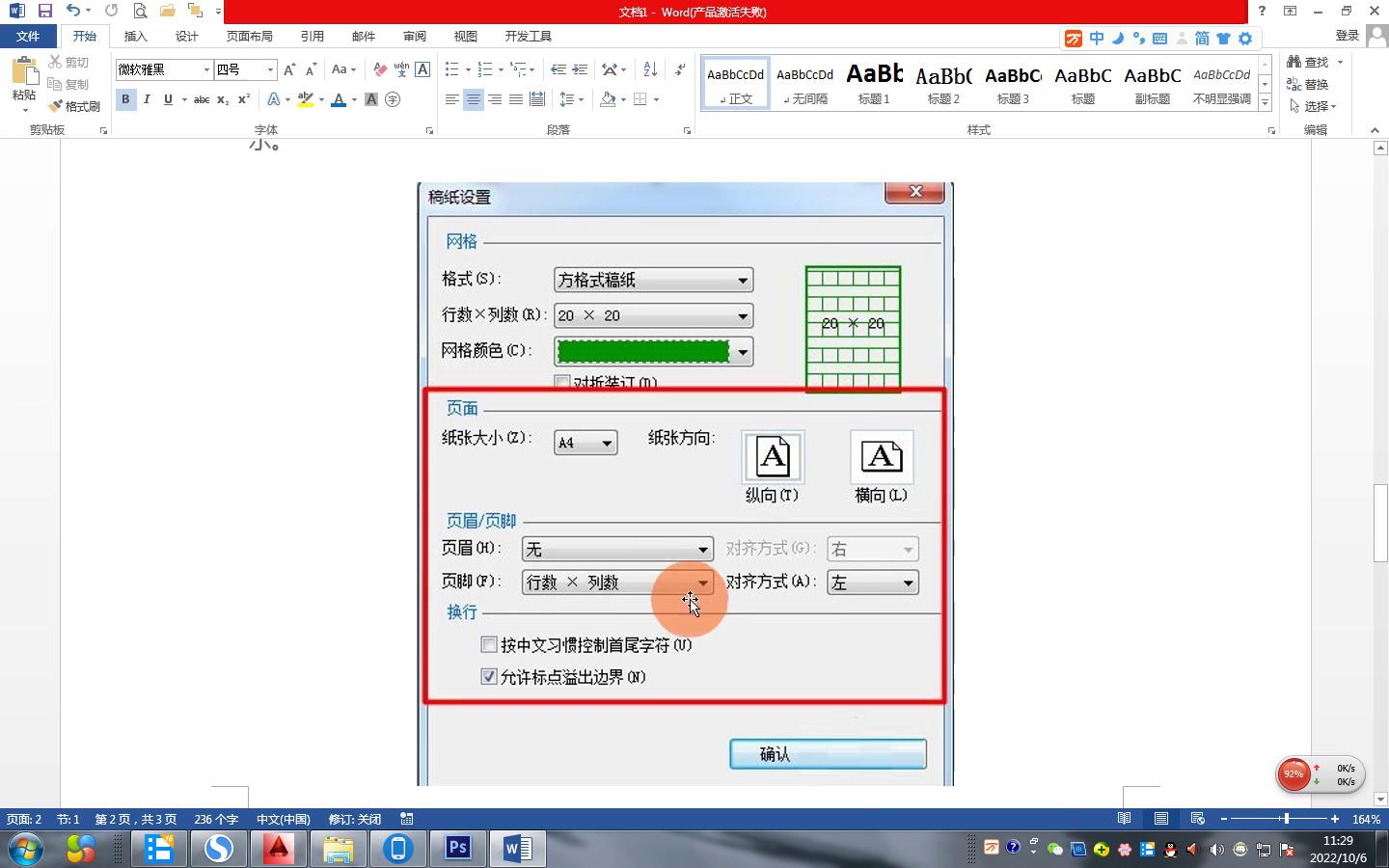 ·第四步,最后设置页面,比如这个页面有什么特点?还是横向还是纵向?比如是纵向,页面页角以及换行设置页面,比如没有页角是行数乘列数对齐方式,比如组对齐,其他末日就可以了。最后点确定,确认一下就可以看到了设置稿纸的样式,就能看到设置稿纸的样式。