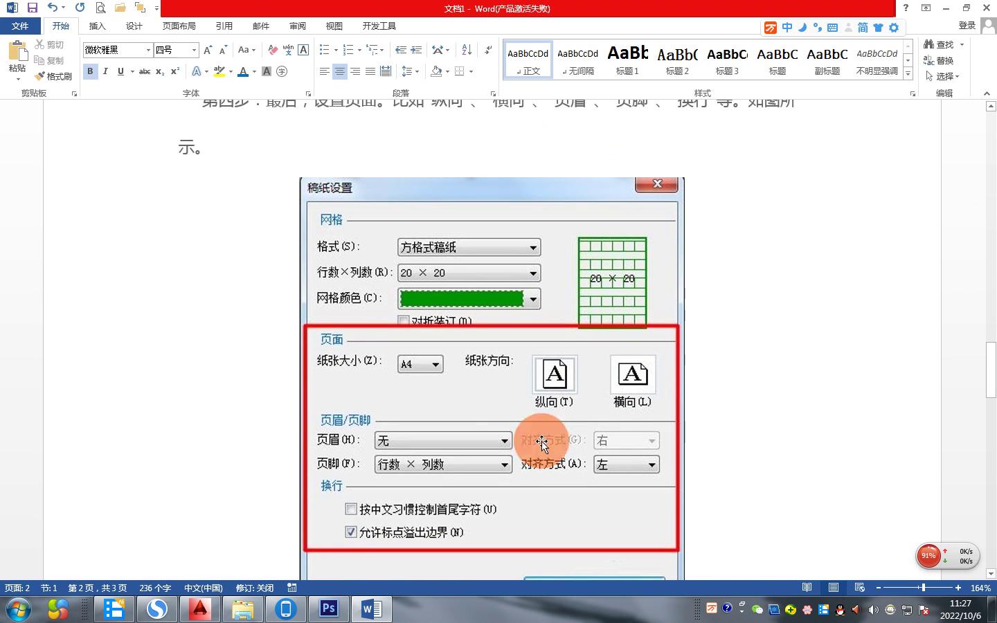 ·第四步,也很重要,最后进入页面设置里面,页面设置在网格格式,方格纸搞下面,方格纸搞方格式稿纸下面,比如稿纸放在a4纸上面用横向排版,纵向排版,但可以设置横向,页面页角用页角显示多少行多列,所以页角选择行数乘列数,飞行方式默认组一起的,加默认就可以了。