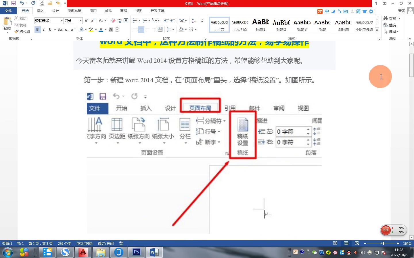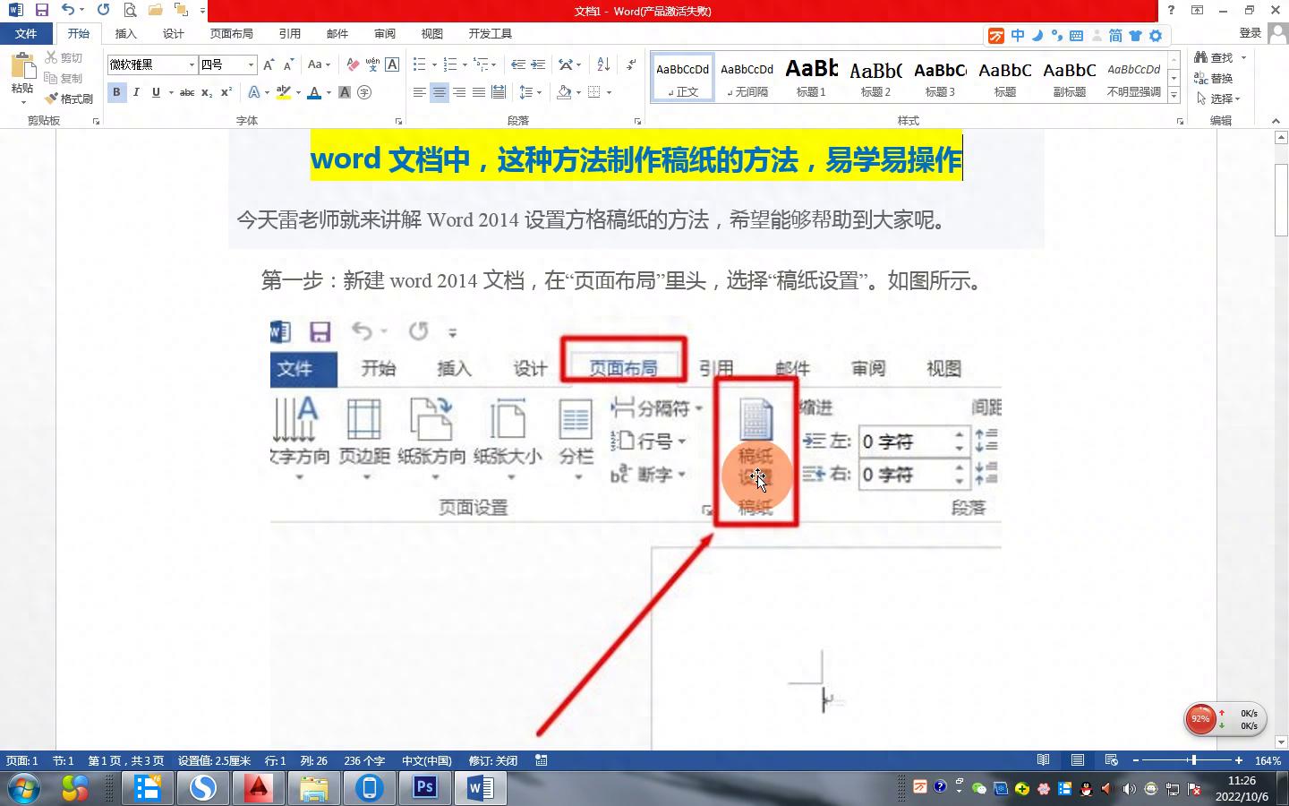 ·第一步,在页面布局,点击页面布局,这个位置有个稿纸设置,再点击稿纸设置按钮,点击稿子设置按钮勾画进入第二步,弹出稿子设置按钮,弹出对话框,稿纸设置一个网格,格式里面有好几种格式,比如想用方格纸格式,选择方格纸,方框也就是以小方格构成的。