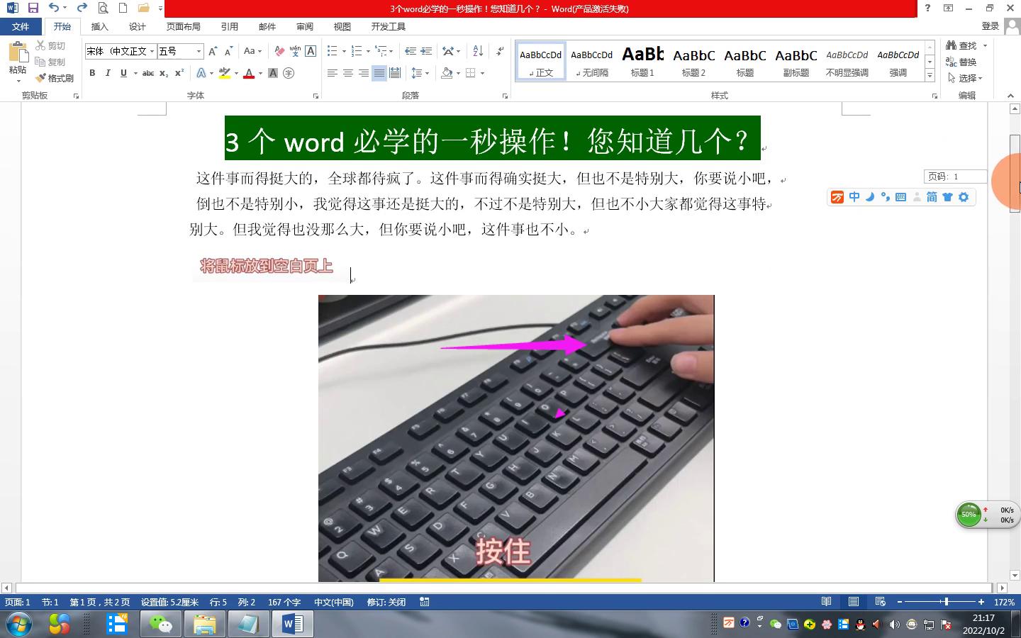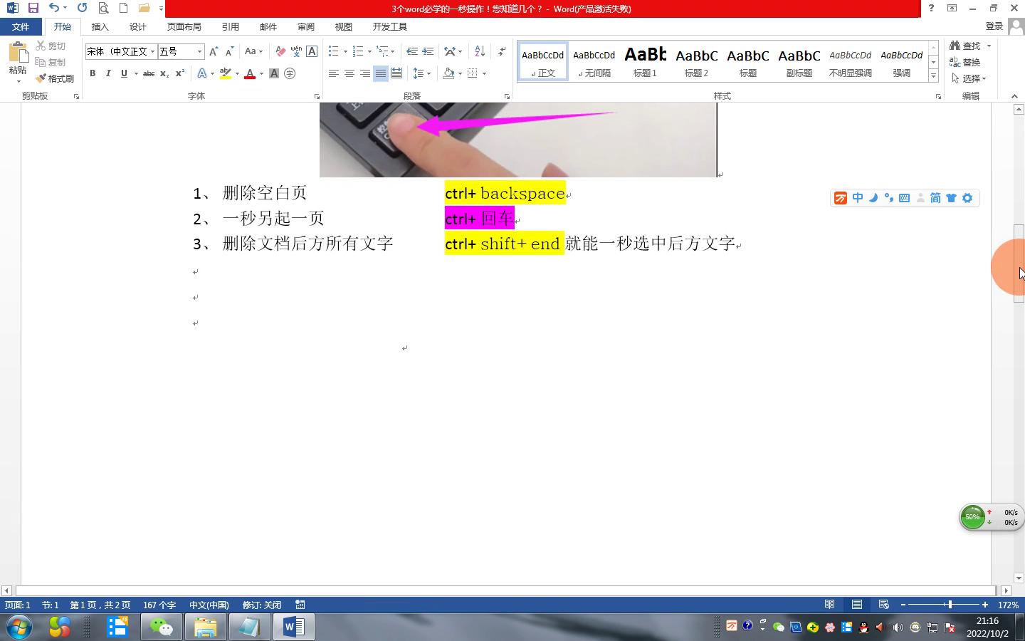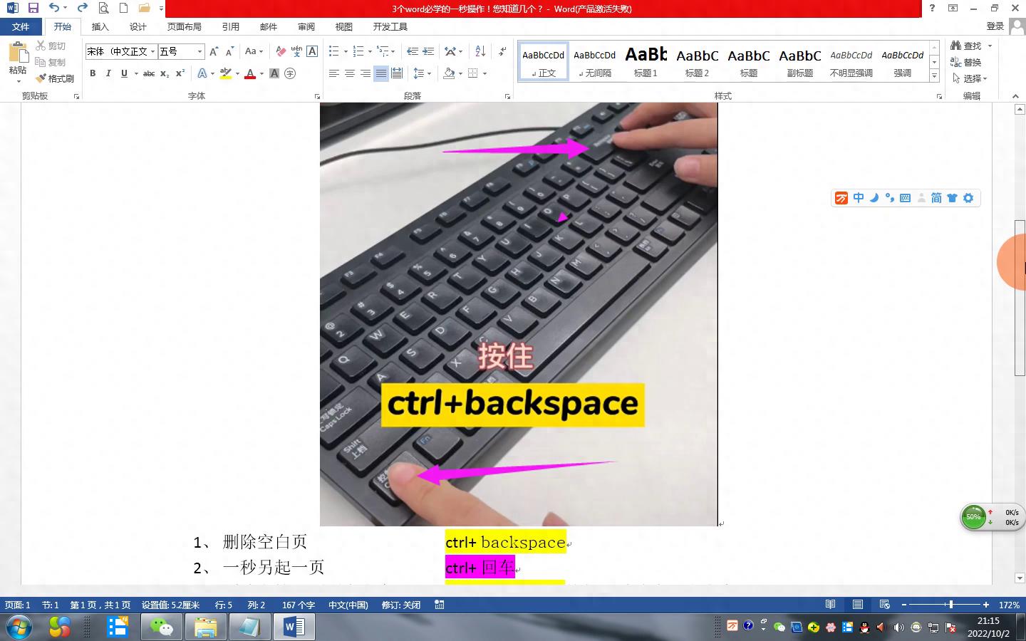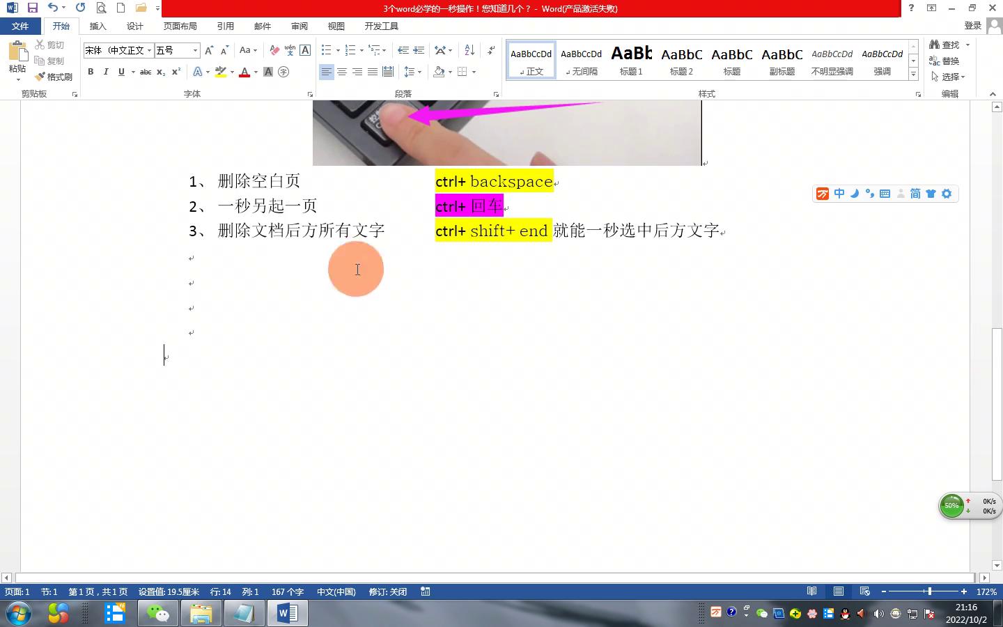·第二个小技巧就一秒逆行页,就是快速的创建新的页面。直接把光标放在当前页面的下面,然后ctrl加回车键,那么它就删除这个,就新建一个新的页面,比较快捷。