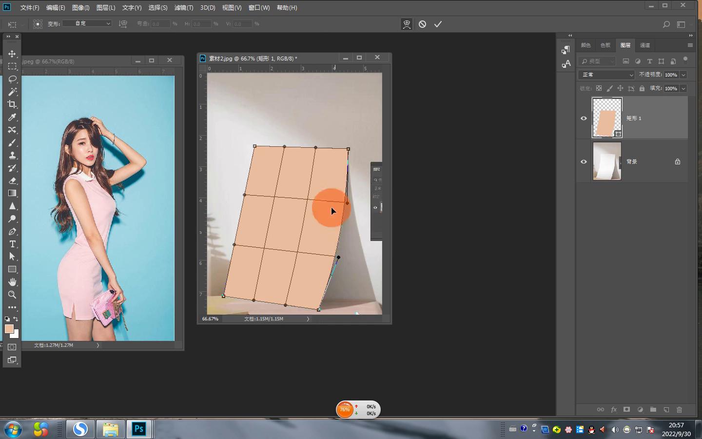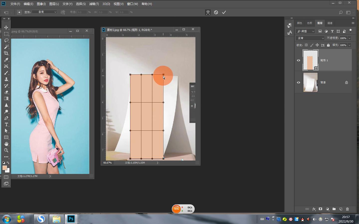 ·首先想把女孩放在弯曲的曲面上面,肯定要画一个曲面和它吻合。画一个曲面和它吻合的方法非常多,可以用什么?用形状工具。先用矩形工具来操作,但为了好编甲都知道要新旧图层,所以讲第一大步。