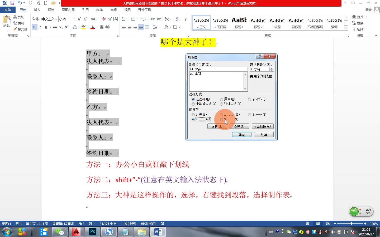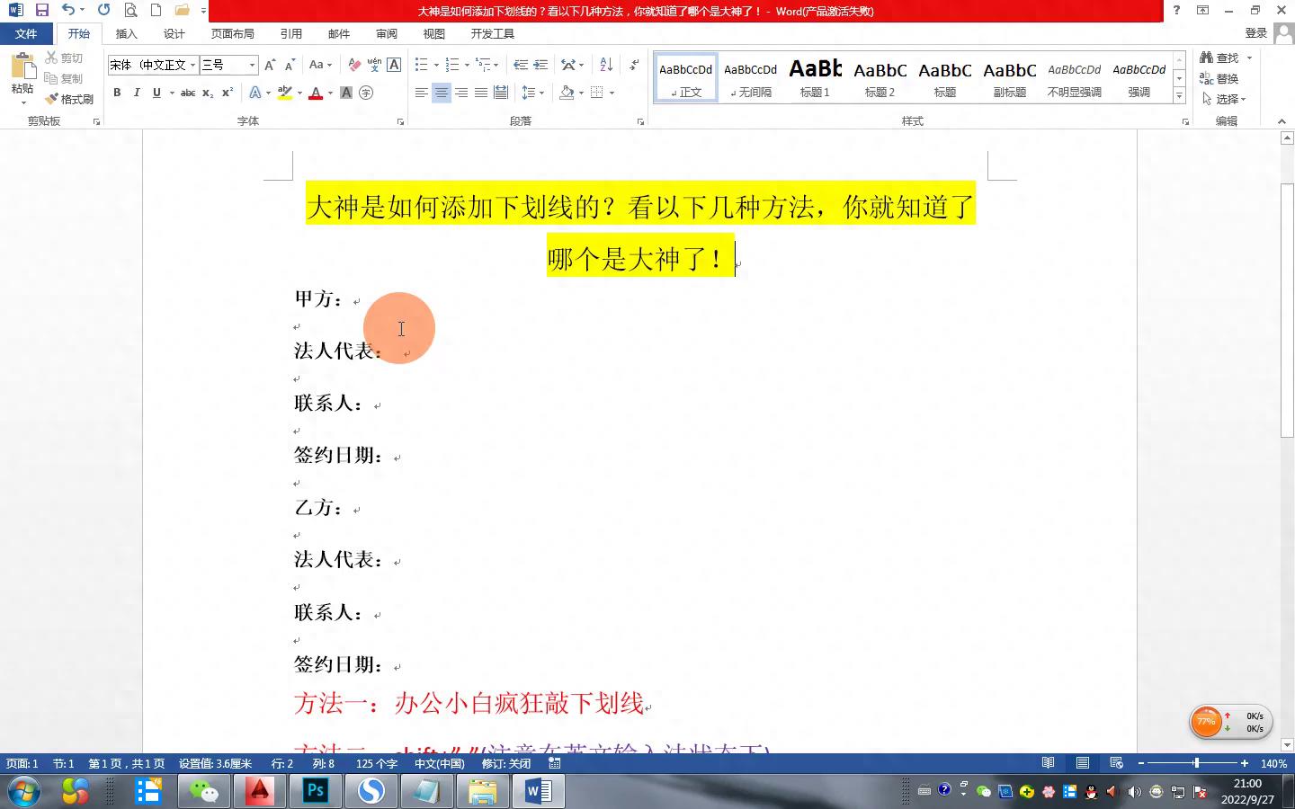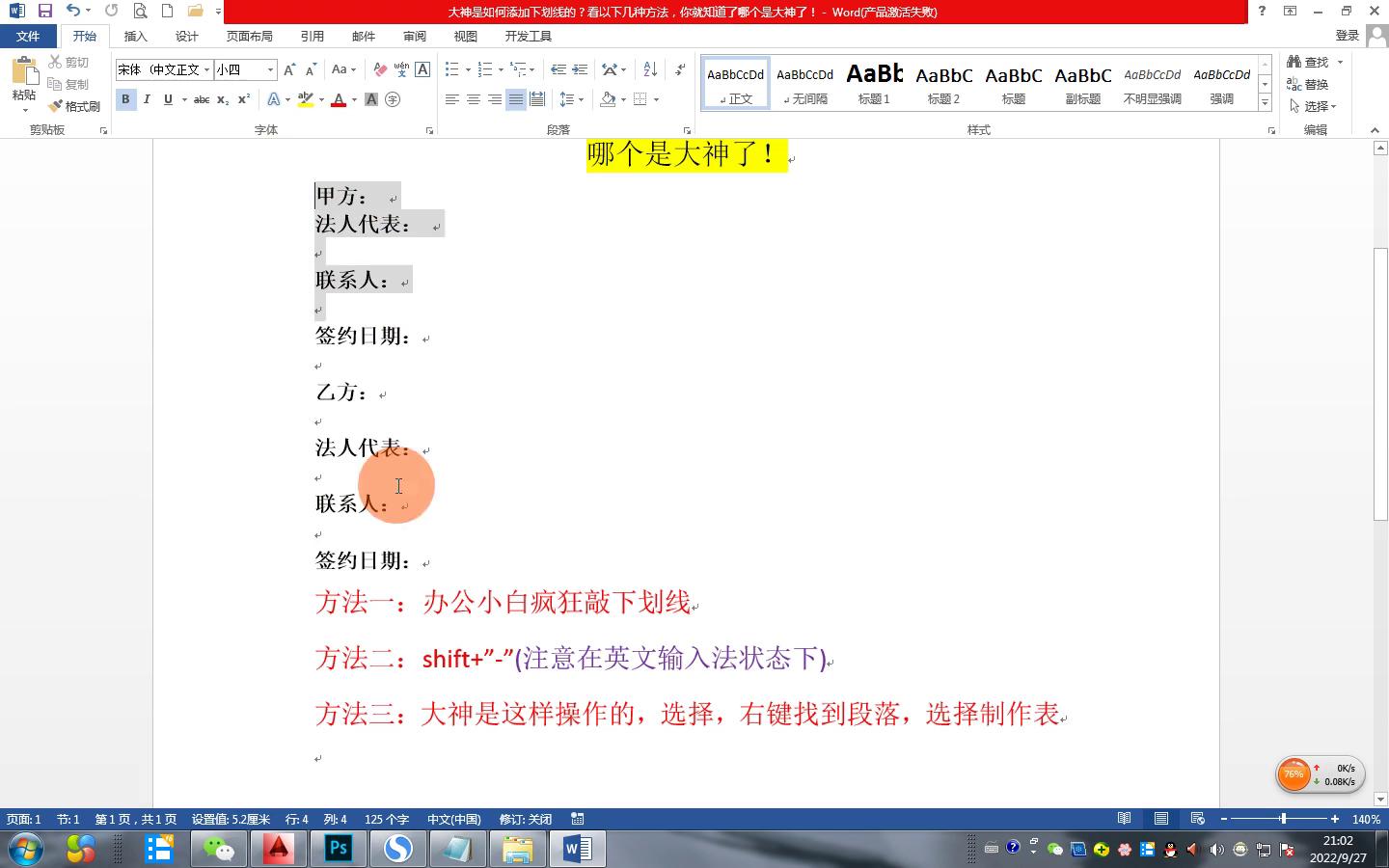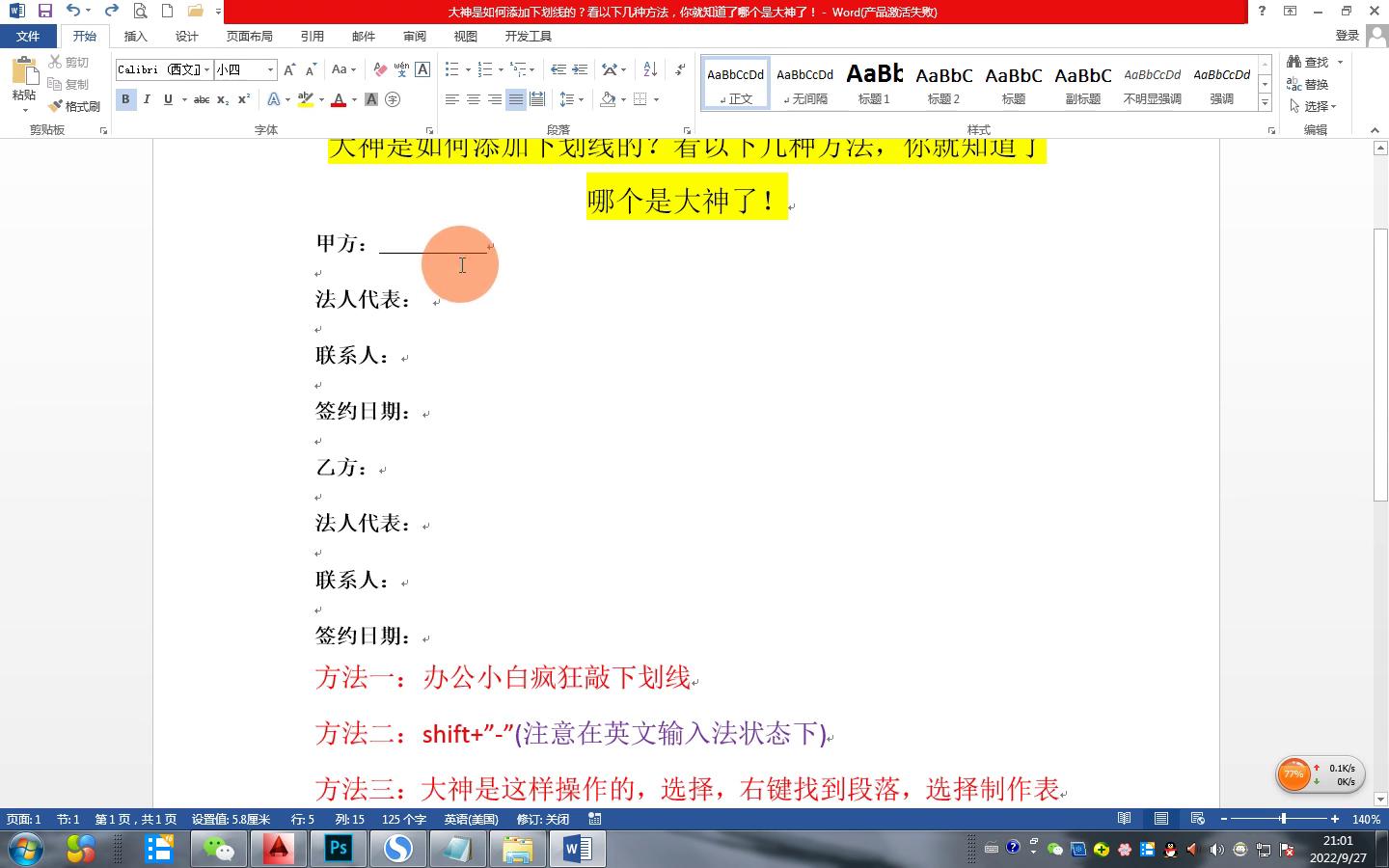 第一种方法:小白疯狂的敲下划线。也就是选中它,把光标放在冒号后面,按住下滑线按钮,然后空格键。这是一种方法。当然可以用快捷键ctrl加右键,它是个开关键,按一下起作用,起作用就是空格键是可以的。这是一种方法。当然这种方法虽然不好理解,但是一旦需要添加下划线的文字比较多就很麻烦了。