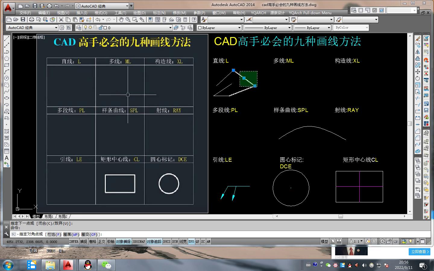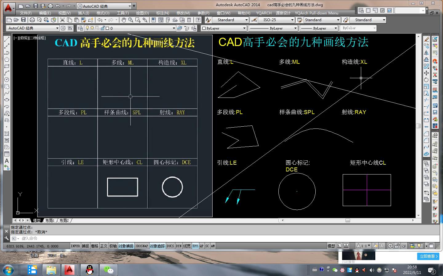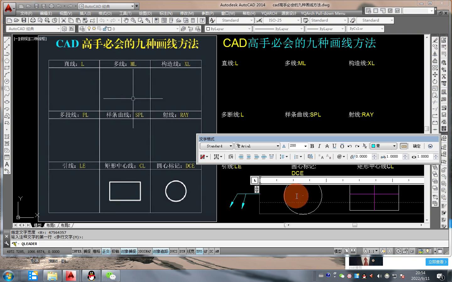 ·第九种:引线。在命令函数L、E空格,先选中引线引线点,针胶关闭,画个斜线,再针胶打开,再输入文字,回车键,回车,输入文字,这就引线,非常方便。